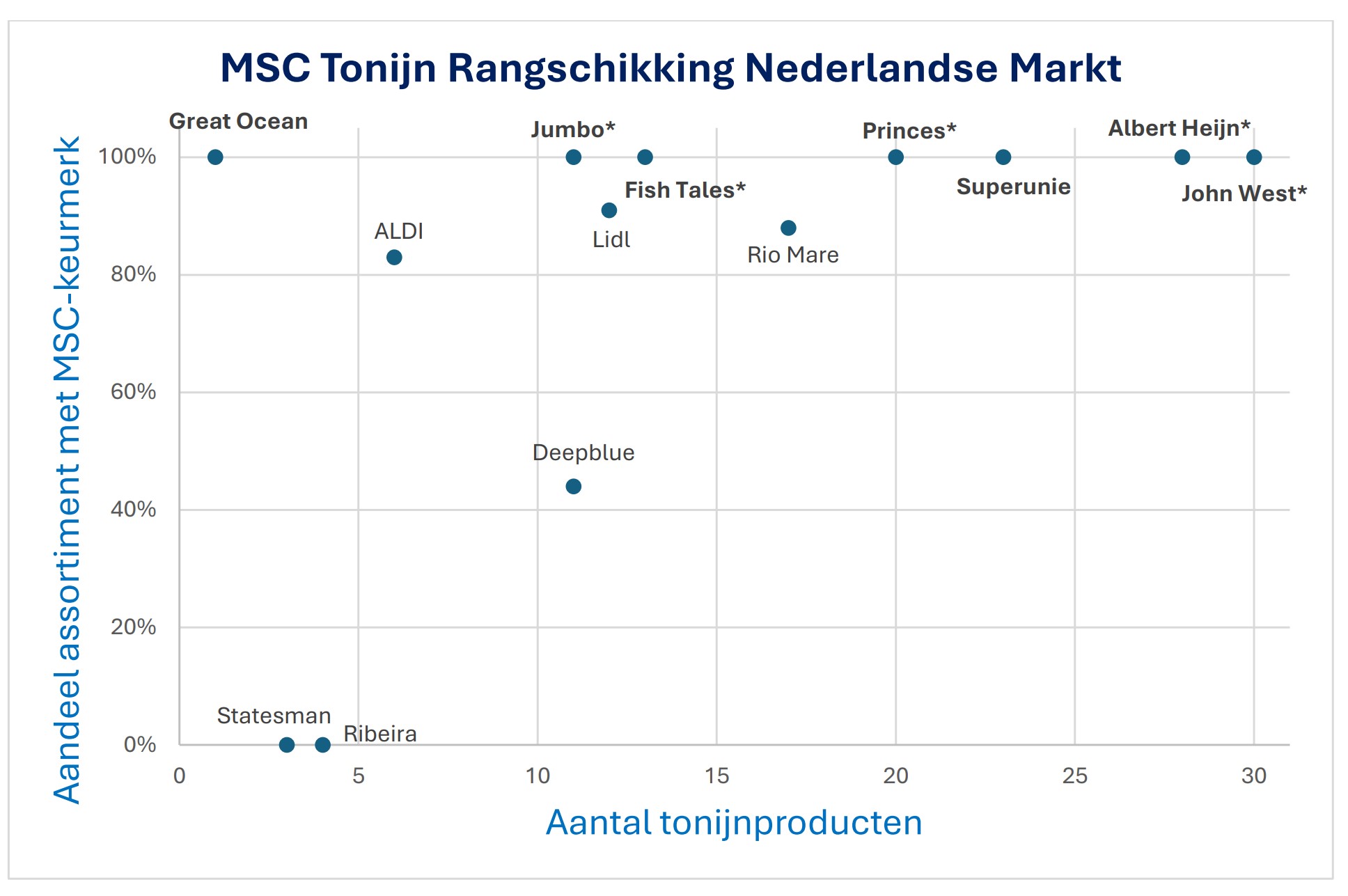 Merken als Deepblue, te vinden bij Superunie-leden, kunnen voor het grootste deel van hun producten nog grotere stappen zetten op het gebied van duurzaamheid. Concrete plannen om deze producten zonder MSC-keurmerk te verduurzamen zijn bij MSC ook niet bekend. Hetzelfde geldt voor het merk Ribeira, dat enkel bij Jumbo wordt verkocht. Echter, ook voor goedkopere merken is er geen excuus om geen MSC-keurmerk te dragen. Statesman, te koop bij Superunie-leden en Albert Heijn, heeft nu geen keurmerk op de tonijn. Echter, hebben zij wel al concrete en geplande stappen gedeeld om een volledig tonijnassortiment te behalen waarop het blauwe MSC logo is te vinden, in het voorjaar van 2026.