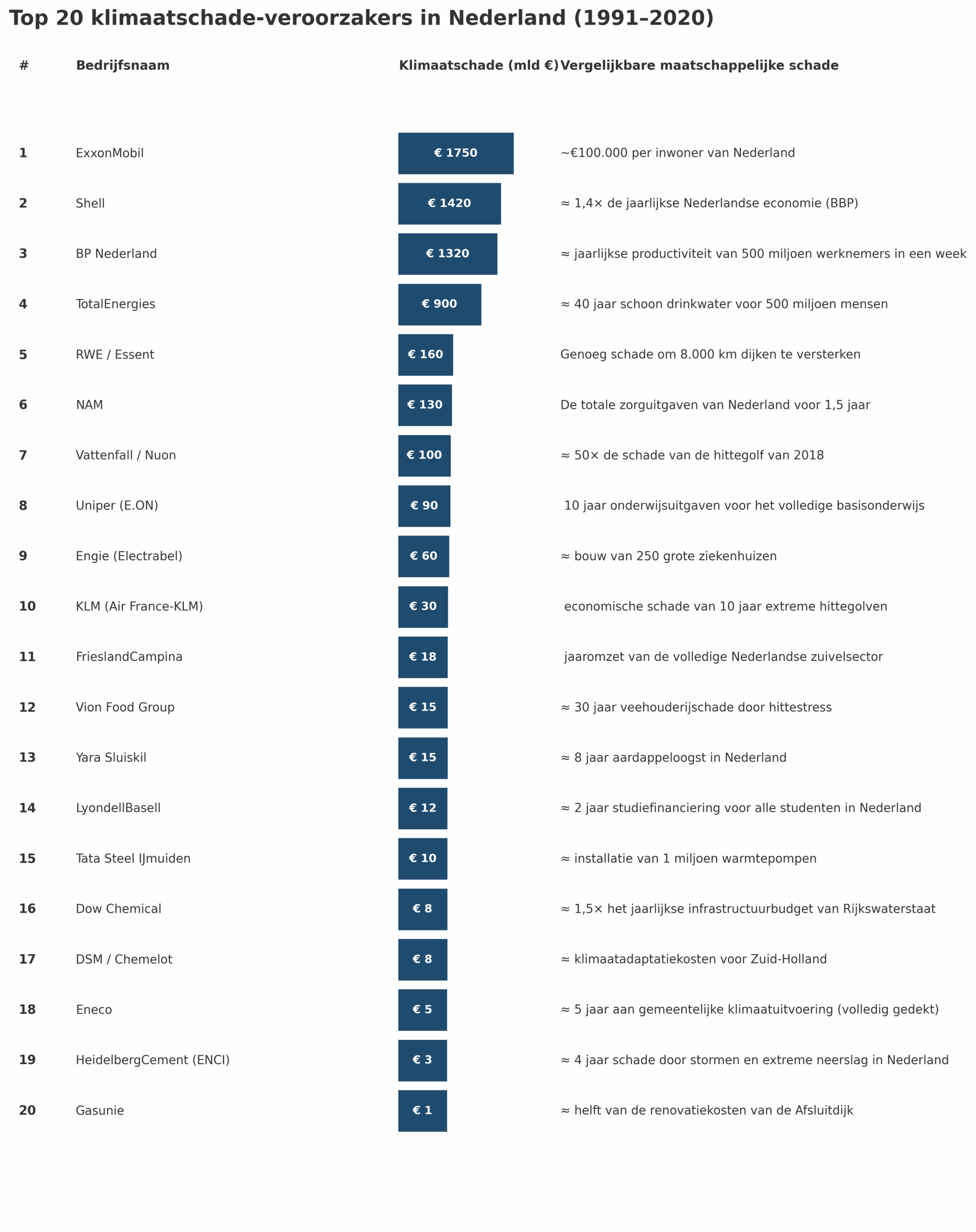 Top 20 klimaatschade-veroorzakers in Nederland (1991–2020)