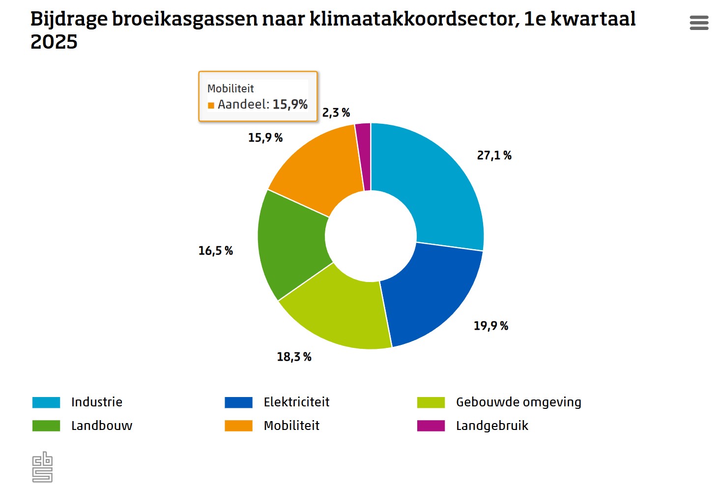 De mobiliteitssector stootte echter 5 procent minder uit in het eerste kwartaal van 2025. Dat kwam vooral door minder verkoop van diesel. Er werd meer in het buitenland getankt, omdat diesel vooral in Luxemburg en Duitsland goedkoper is dan in Nederland en het prijsverschil groter werd. Daarnaast zijn vooral dieselauto’s van zakelijke rijders die bovengemiddeld veel rijden, vervangen door volledig elektrische en plug-in hybride auto’s. De bijdrage van deze sector aan de totale uitstoot nam af van 18 procent in het eerste kwartaal van 2024 naar 16 procent in 2025.