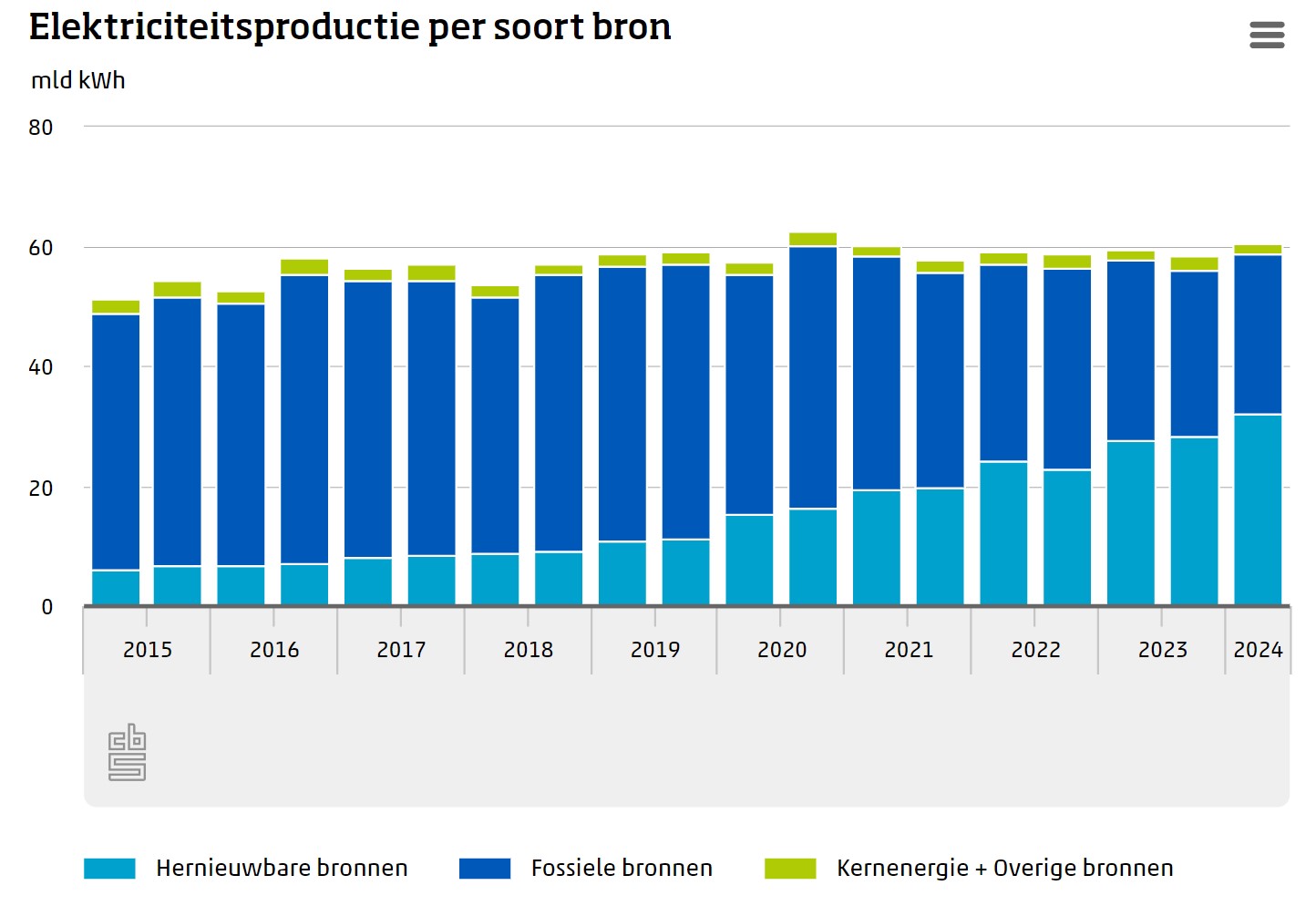 De elektriciteitsproductie uit hernieuwbare bronnen is in de eerste helft van 2024 gestegen naar 32,3 miljard kWh. Hiermee kwam het aandeel hernieuwbare elektriciteit op 53 procent van de totale elektriciteitsproductie. De invoer van elektriciteit steeg en de uitvoer nam af. Nederland heeft per saldo in de eerste 6 maanden van 2024 2,3 miljard kWh meer uitgevoerd dan ingevoerd. Dit meldt het CBS op basis van nieuwe cijfers. De productie is in dezelfde periode met 1 procent gestegen naar 60,5 miljard kWh. Voor het eerst is er in de eerste 6 maanden van een jaar met 53 procent, meer elektriciteit geproduceerd met hernieuwbare bronnen dan met fossiele bronnen. Het verbruik van elektriciteit is in de eerste helft van 2024 met 5 procent gestegen naar 55,8 miljard kWh. Dit is iets onder het niveau van voor corona.