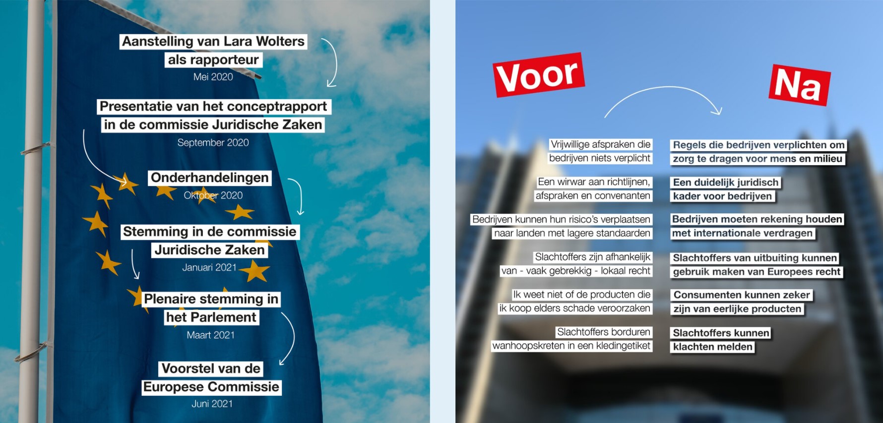 “Het Europees Parlement heeft deze week de kans om een leider te worden op het gebied van maatschappelijk verantwoord ondernemen”, aldus de Nederlandse rapporteur Lara Wolters (S&D) tijdens het debat op maandag. “Voor bedrijven creëren we een gelijk speelveld en juridische duidelijkheid. Voor consumenten zorgen we voor eerlijke producten. Voor werknemers verbeteren we de bescherming. Voor slachtoffers verbeteren we de toegang tot de rechtspraak. En voor het milieu zetten we een stap die al heel lang geleden hadden moeten nemen.”