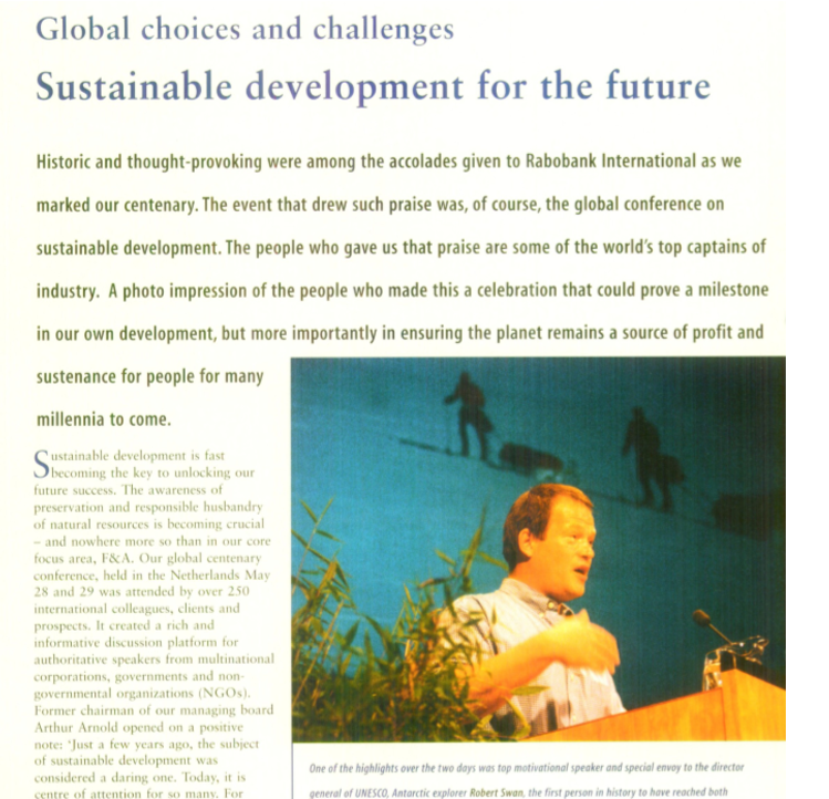 In 1998 vierde de Rabobank haar 100-jarig bestaan. In mei van dat jaar, nu 20 jaar geleden, organiseerde Rabobank een internationaal 2-daags congres met als titel ‘Sustainability – choices and challenges for future development’. Dit eerste congres over duurzaamheid in Nederland was de inspiratiebron voor het oprichten van het Nationaal Sustainability Congres (NSC) met een eerste editie in maart 2000.