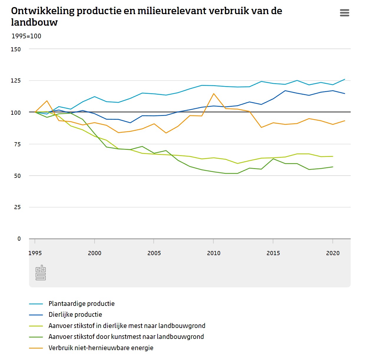 De plantaardige en de dierlijke landbouwproductie zijn beide sinds 1995 gestegen. De stijging van de plantaardige productie kwam tot stand ondanks verminderd gebruik van (kunst)mest. De hoeveelheid via dierlijke mest naar landbouwgrond aangevoerde stikstof daalde tot 2012 met 41 procent en nam daarna weer iets toe. De via kunstmest aangevoerde stikstof daalde volgens een vergelijkbaar patroon. Het verbruik van niet-hernieuwbare energie door de landbouw, zoals aardgas, lag in 2021 na diverse pieken en dalen iets lager dan 25 jaar geleden.