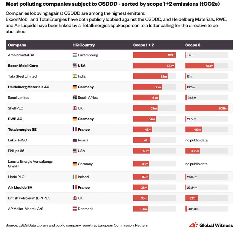 Global Witness stelt dat de gegevens de impact benadrukken die de nieuwe klimaatrichtlijn nog steeds kan hebben op de aanpak van vervuiling en de noodzaak om verdere verwatering tegen te gaan. De gegevens laten ook zien welke bedrijven het meest vervuilend zijn en worden getroffen door de CSDDD-wetgeving, waaronder ArcelorMittal, ExxonMobil, Tata Steel, Shell, RWE en TotalEnergies.