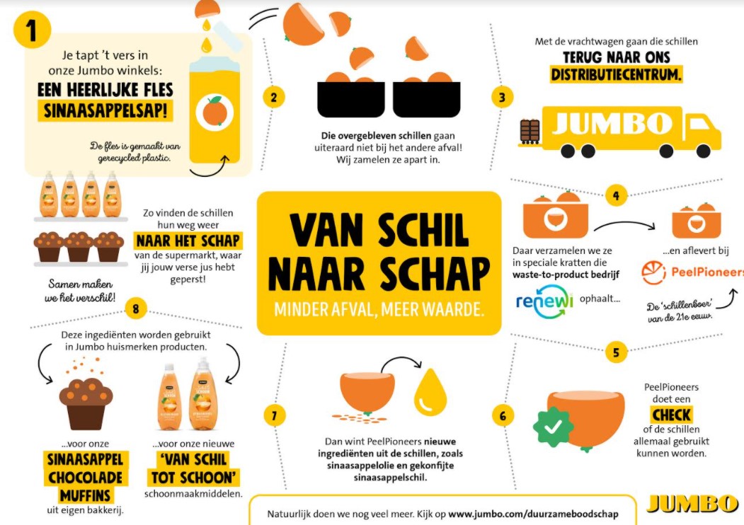 Jumbo geeft miljoenen sinaasappelschillen een tweede leven door een nieuwe manier van inzameling. Door de nieuwe werkwijze, opgezet in samenwerking met waste-to-product bedrijf Renewi, groeit het aantal kilo’s sinaasappelschillen dat wordt ingezameld door Jumbo samen met Renewi tot zo’n 10 miljoen per jaar. In 2019 was dit nog zo’n 5,5 miljoen kilogram. De sinaasappelschillen worden na inzameling door PeelPioneers, marktleider in circulaire oplossingen voor reststromen van citrus, verwerkt tot nieuwe ingrediënten. Van de sinaasappelschillen die PeelPioneers in totaal verwerkt is tot wel 50 procent afkomstig van Jumbo. Afgelopen tijd hebben Jumbo en PeelPioneers zich ook ingespannen om de schillen te verwerken tot ingrediënten voor een nieuwe lijn Jumbo huismerk schoonmaakmiddelen. Deze zijn onder de naam ‘van Schil tot Schoon’ vanaf begin november verkrijgbaar. Ook worden de schillen omgezet tot gekonfijte sinaasappelschil, die wordt gebruikt als ingrediënt voor de sinaasappel-chocolade muffins uit eigen bakkerij.