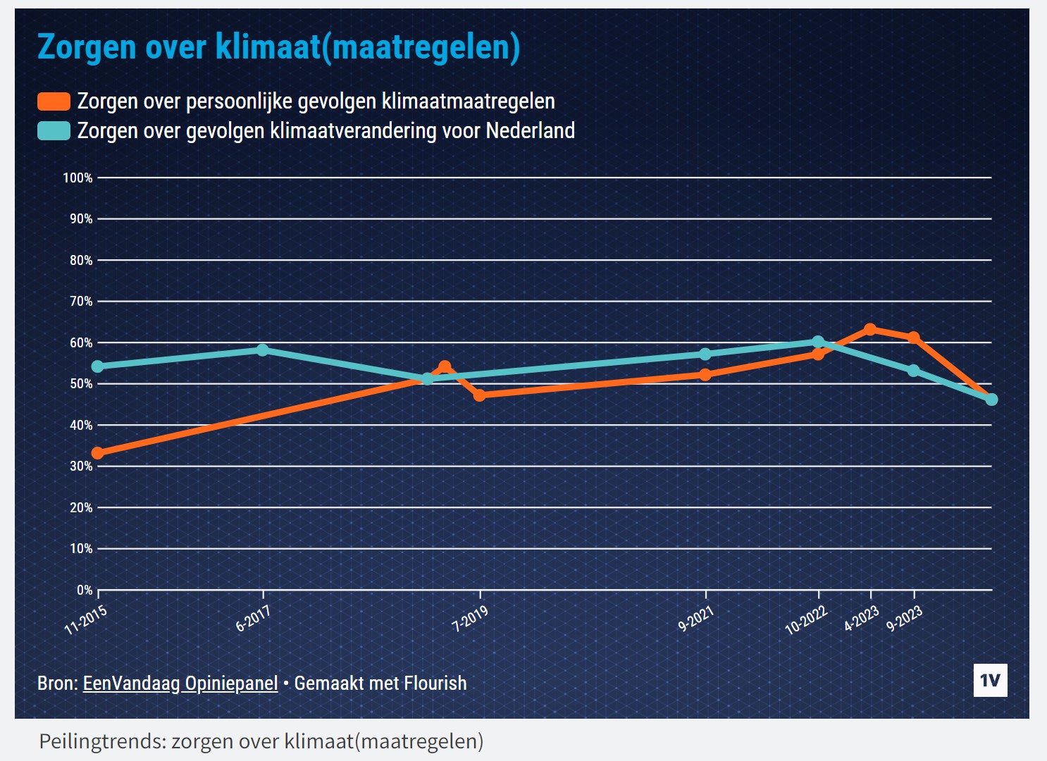 In vergelijking met september vorig jaar maken minder mensen zich zorgen over de gevolgen van klimaatverandering voor Nederland, en minder over de maatregelen om dit tegen te gaan. Reden voor die daling: wisselvallig overheidsbeleid en een rechts kabinet. Dat blijkt uit onderzoek van EenVandaag onder ruim 21.000 leden van het Opiniepanel. Waar vorig jaar nog zo’n 6 op de 10 (61 procent) zich zorgen maakten over de – in hun ogen – dure klimaatmaatregelen, is dat nu minder dan de helft (46 procent). En waar sommigen verwachten dat het coalitieakkoord voor minder financiële lasten zal zorgen, zijn anderen ontevreden over de ‘weinig ambitieuze plannen’ en het ‘inconsistente beleid’.