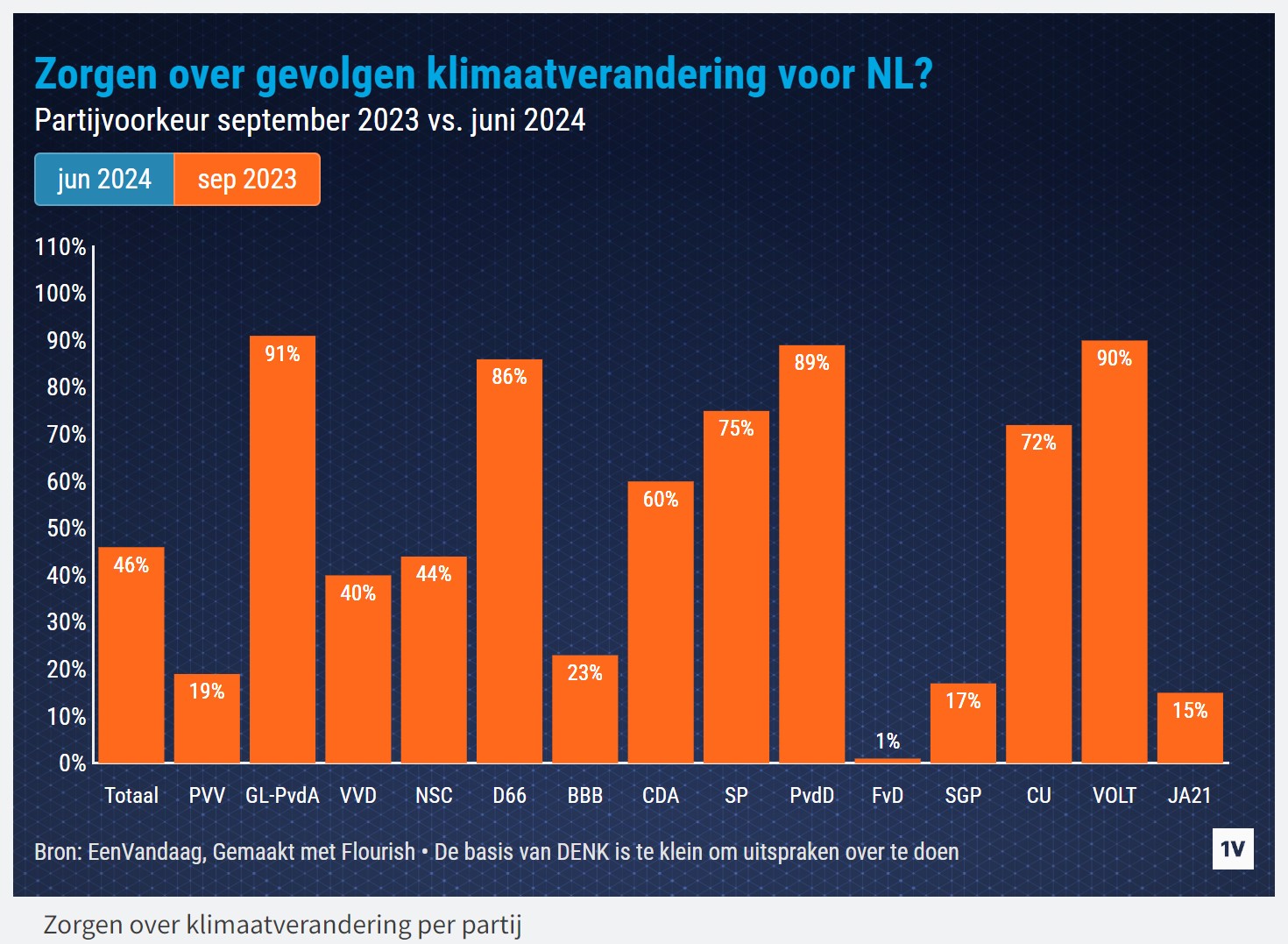 Een uitsplitsing naar politieke voorkeur laat zien dat het vooral kiezers van (centrum-)rechtse partijen als de VVD en NSC zich minder zorgen zijn gaan maken over de gevolgen van klimaatverandering, dan de – toen nog potentiële – stemmers van die partijen in september deden. Zij vinden bijvoorbeeld dat andere zaken prioriteit hebben, zoals woningbouw, zorg of bestaanszekerheid.