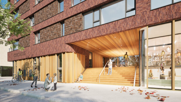 In de gevel is een hoofdrol weggelegd voor de royale poort naar de binnentuin op de halfverdiepte parkeergarage. Naast de poort komen een makkelijk bereikbare collectieve fietsenberging voor duurzame mobiliteit en een commerciële ruimte voor bijvoorbeeld daghoreca als ‘huiskamer van de buurt’. De houten gevelbekleding van het groene hart reikt via de poort naar de straat. De afgeronde hoeken versterken dit uitnodigende gebaar en begeleiden de bezoekers naar binnen.
