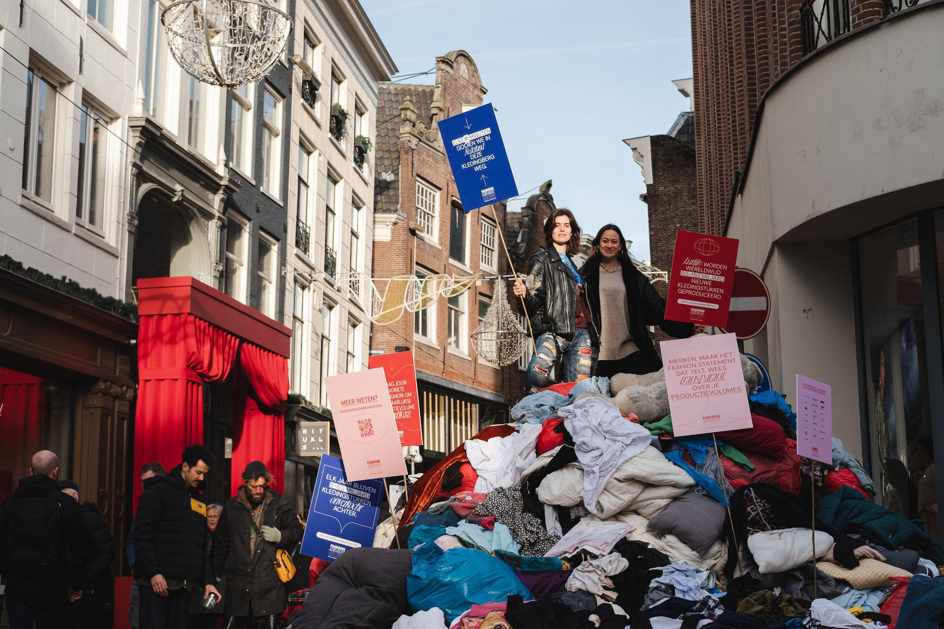 Gepubliceerd 20 december 2024 op 1920 × 1280 in Modeprotest in Kalverstraat: enorme berg van afgedankte kleding vraagt aandacht voor onnodige verspilling