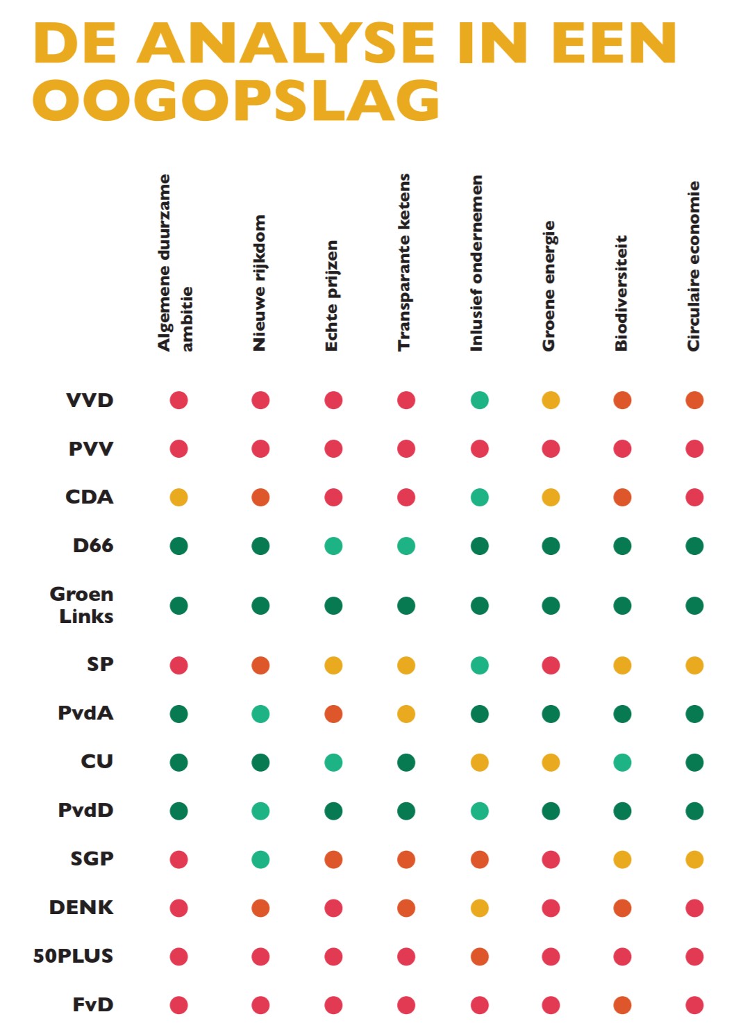 De meeste weerklank voor de thema’s van de nieuwe economie – ook gebruikt in de Nieuwe Businessagenda (NBA) van MVO Nederland – is te vinden bij GroenLinks, D66 en de Partij voor de Dieren. De verkiezingsprogramma’s van deze partijen staan nagenoeg geheel in het teken van het streven naar een nieuwe, duurzame economie. De PVV en Forum voor Democratie hechten het minste belang aan de zeven duurzaamheidsthema’s. Deze partijen zijn tegen elke klimaatmaatregel en ontkennen bijvoorbeeld het stikstofprobleem.