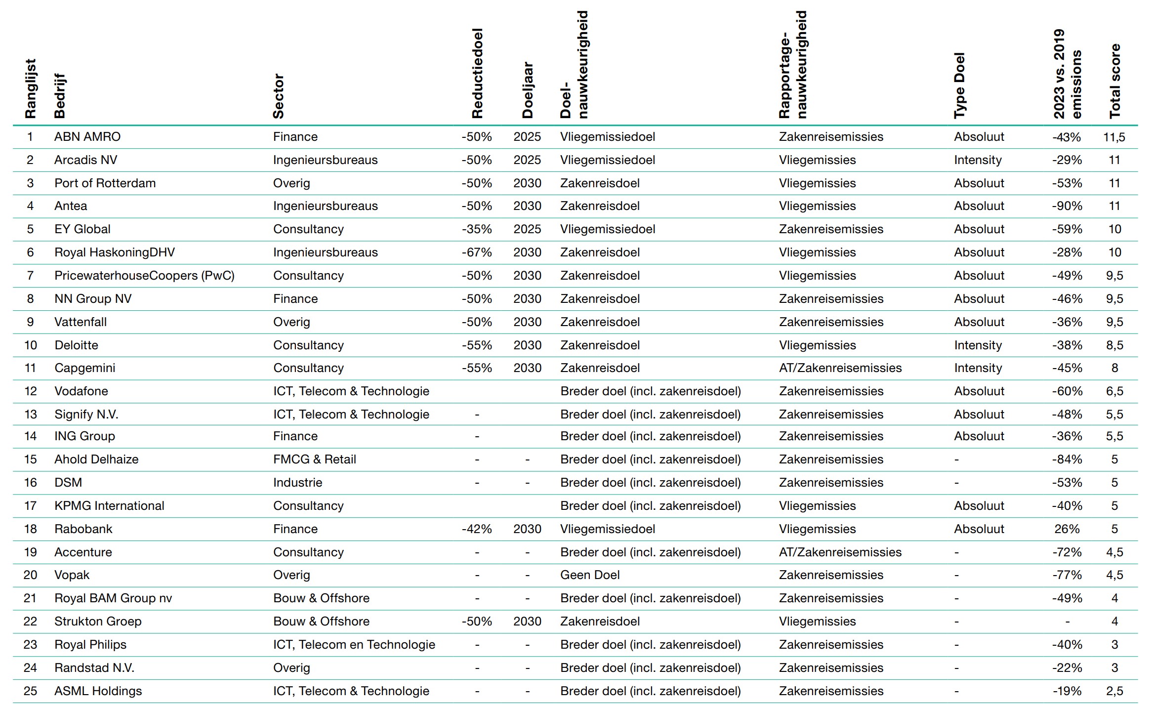 Koploper is ABN AMRO. Zij maken werk van de vermindering van zakelijk vliegen met een duidelijk, kortetermijn reductiedoel (2025) en rapporteren hier helder over. Chief Sustainability Officer Solange Rouschop van ABN AMRO: ‘Wij zijn blij met deze erkenning voor onze inspanningen. Wij gaan door op deze weg en blijven onze collega’s meenemen in de veranderingen op gebied van zakelijke reizen, zodat iedereen zijn steentje kan en wíl blijven bijdragen door minder te vliegen en meer de trein te nemen.’