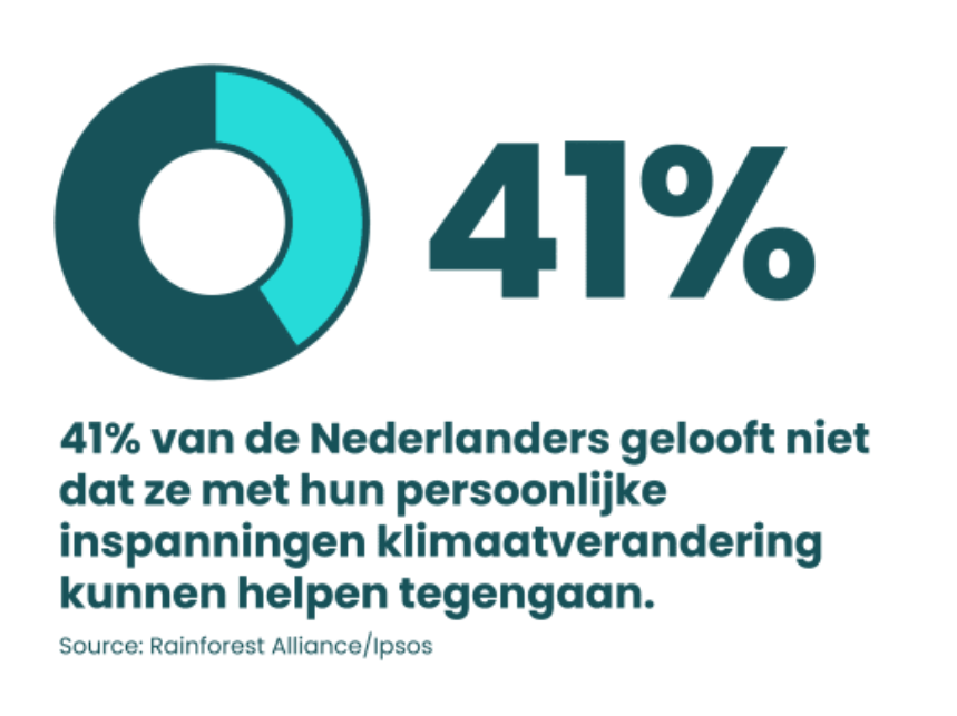 Uit nieuw onderzoek, uitgevoerd door Ipsos, in opdracht van de Rainforest Alliance blijkt dat 41% van de Nederlandse volwassenen in de leeftijd van 16-75 jaar niet gelooft dat hun individuele inspanningen een positief verschil kunnen maken om klimaatverandering tegen te gaan. In andere delen van de wereld is het percentage ‘klimaatpessimisten’, dat wil zeggen mensen die niet geloven dat ze een positief verschil kunnen maken, een stuk kleiner: Brazilië (10%), Duitsland (21%), Verenigd Koninkrijk (33%) en de Verenigde Staten (34%). De Rainforest Alliance strijdt voor een wereld waar mens en natuur in balans zijn. En daar is iedereen bij nodig; overheden, het bedrijfsleven én een opeenstapeling van acties van individuen. Middels de wereldwijde boodschap ‘Pessimism is out. We’re All In!’ roept de NGO op tot optimisme, alleen zo kunnen we, met elkaar, het nodige verschil maken tegen klimaatverandering.