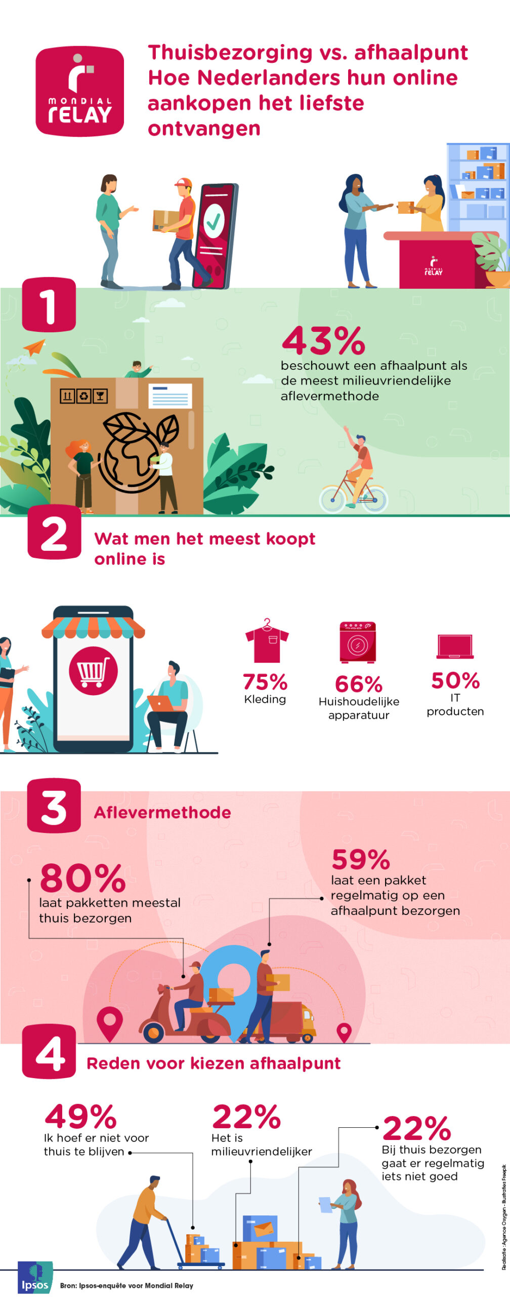 Waar laten Nederlanders hun online aankopen het liefst bezorgen en houden zij hierbij rekening met het milieu? De Europese pakketservice Mondial Relay, met zo’n 1.000 afhaalpunten sinds dit jaar ook actief op de Nederlandse markt, stelde deze vraag in samenwerking met onderzoeksbureau Ipsos aan 1.000 consumenten om een beter beeld te krijgen van de markt. Hoewel de meerderheid haar pakketten thuis laat bezorgen, kiezen steeds meer mensen voor een afhaalpunt. Zo’n 43% beschouwt een afhaalpunt als de meest milieuvriendelijke aflevermethode. Voor 22% is de mogelijkheid om te kiezen voor een afhaalpunt van invloed op de aankoopbeslissing.
