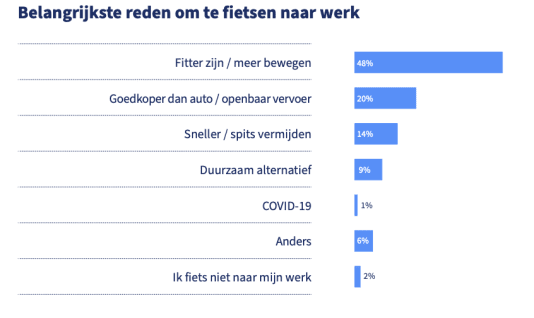 “Dit is niet los te zien van de opmars van de e-bike en speed pedelec”, zegt Lonneke van der Horst, Strategy Director bij ALD Automotive. “Mensen hebben aandacht voor hun gezondheid, willen het drukke verkeer vermijden en iets doen voor het milieu. De e-bike draagt daaraan bij.” De resultaten uit het onderzoek ondersteunen de mening van Van der Horst. Vitaliteit, lage kosten, spitsmijden en duurzaamheid spelen een belangrijke rol in de keuze voor de fiets of e-bike. Waar COVID-19 een jaar geleden voor 14 procent van de ondervraagden nog een reden was om de fiets te pakken, geeft slechts een enkeling (1 procent) dit nu nog als reden om de fiets te pakken.