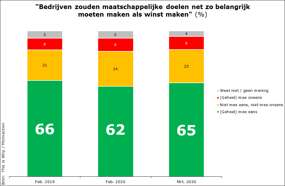67% van de Nederlanders vindt dat de overheid wettelijk mag afdwingen dat bedrijven meer maatschappelijke verantwoordelijkheid nemen als dat nodig is. Dat is een grote stijging van 12 procentpunt ten opzichte van zes weken geleden, voordat het coronavirus Nederland bereikte. 65% vindt dat bedrijven maatschappelijke doelen zelfs net zo belangrijk moeten maken als winst maken. En de helft (51%) vindt dat de marktwerking in ons land te ver is doorgeschoten. Ook blijkt dat de waardering van de maatschappelijke rol van de overheid in de afgelopen weken veel beter is geworden. Het rapportcijfer voor de overheid steeg van 5,8 naar 6,3, een ongekend hoge stijging in zo’n korte periode. De waardering voor bedrijven bleef stabiel op een 6,0. Een en ander blijkt uit de Maatschappelijke Impact Monitor, een onderzoek in opdracht van adviesbureau This Is Why dat is uitgevoerd door Motivaction.