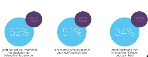 Het onderzoek laat zien dat een op de twee Nederlanders de laatste jaren duurzamer is gaan leven en consumeren. Opvallend is dat er grote verschillen zijn in duurzaam gedrag tussen verschillende leeftijdscategorieën. Onder de ondervraagden blijkt de groep 18-34-jarigen in vergelijking met de andere leeftijdsgroepen in en om het huis het minst duurzaam te leven: deze groep gooit vaker voedsel weg, neemt het minst vaak een boodschappentas mee naar de supermarkt en scheidt het minst vaak hun afval. Wel zijn de 18-34-jarigen het meest bereid om extra geld uit te geven aan duurzame producten en diensten. Bij de 55-plussers is het precies andersom; zij zijn significant minder bereid te betalen voor duurzame producten en diensten, maar leven wel het meest duurzaam.