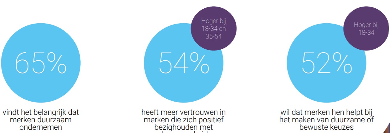 Consumenten verwachten ook van merken dat ze duurzaam ondernemen: een meerderheid van de respondenten (65%) geeft aan dat ze het belangrijk vindt dat merken meegaan met de tijd en het geeft Nederlanders ook vertrouwen in merken. De helft van de Nederlanders wil dat merken hen helpen bij het maken van duurzame of bewuste keuzes, vooral de groep 18-34-jarigen hecht hier waarde aan. Transparantie en communicatie hierover zijn daarom belangrijk. Wees als merk eerlijk over wat je doet op het gebied van duurzaamheid en houd hierbij de doelgroep in gedachten, want een achterstand is zo geboekt: 43% van de consumenten vertrouwt duurzaamheidsclaims van bedrijven niet.