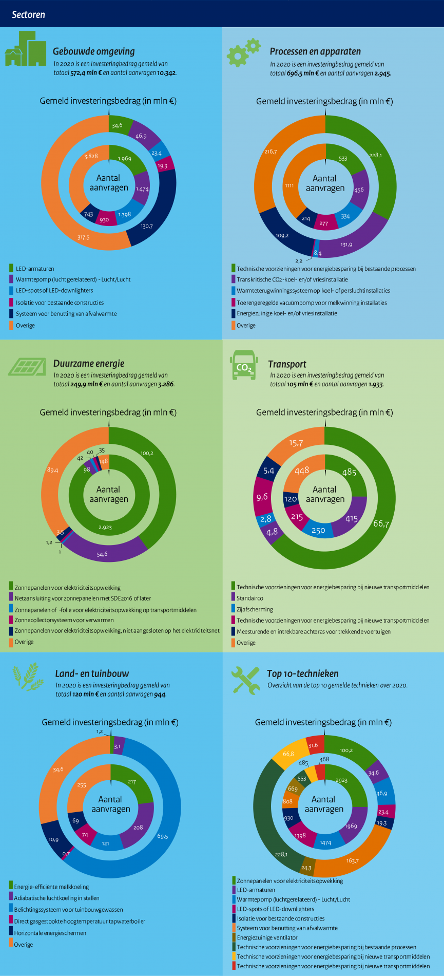 De hoogste investeringen in energiebesparende technieken kwamen voor rekening van de industrie met 700 miljoen euro. Ten opzichte van 2019 is dit een afname van 60 miljoen euro. De gebouwde omgeving staat op een goede nummer twee met 572 miljoen euro aan investeringen, een toename met 15 miljoen euro.