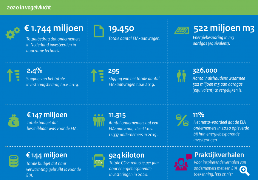 Ondanks Covid-19 hebben Nederlandse bedrijven in 2020 samen voor ruim 1,7 miljard euro aan investeringen in energiezuinige maatregelen gemeld. Dit blijkt uit het nieuw vormgegeven jaarbericht 2020 van de Energie-investeringsaftrek (EIA). De EIA leverde naar verwachting een voordeel van 144 miljoen euro voor Nederlandse bedrijven die investeerden in energiebesparende investeringen. Deze energie-investeringen realiseren een energiebesparing vergelijkbaar met het jaarlijkse gasverbruik van 326.000 huishoudens. De ondernemers brengen met deze investeringen de doelen van de energietransitie dichterbij.
