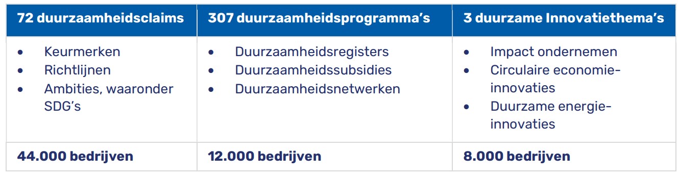 De monitor biedt een omvangrijke, kwantitatieve analyse van het aantal Nederlandse bedrijven die werken aan duurzame oplossingen. Van alle Nederlandse bedrijven zijn ruim 55.000 unieke bedrijven geïdentificeerd die voldoen aan één of meer van de duurzaamheidsindicatoren: