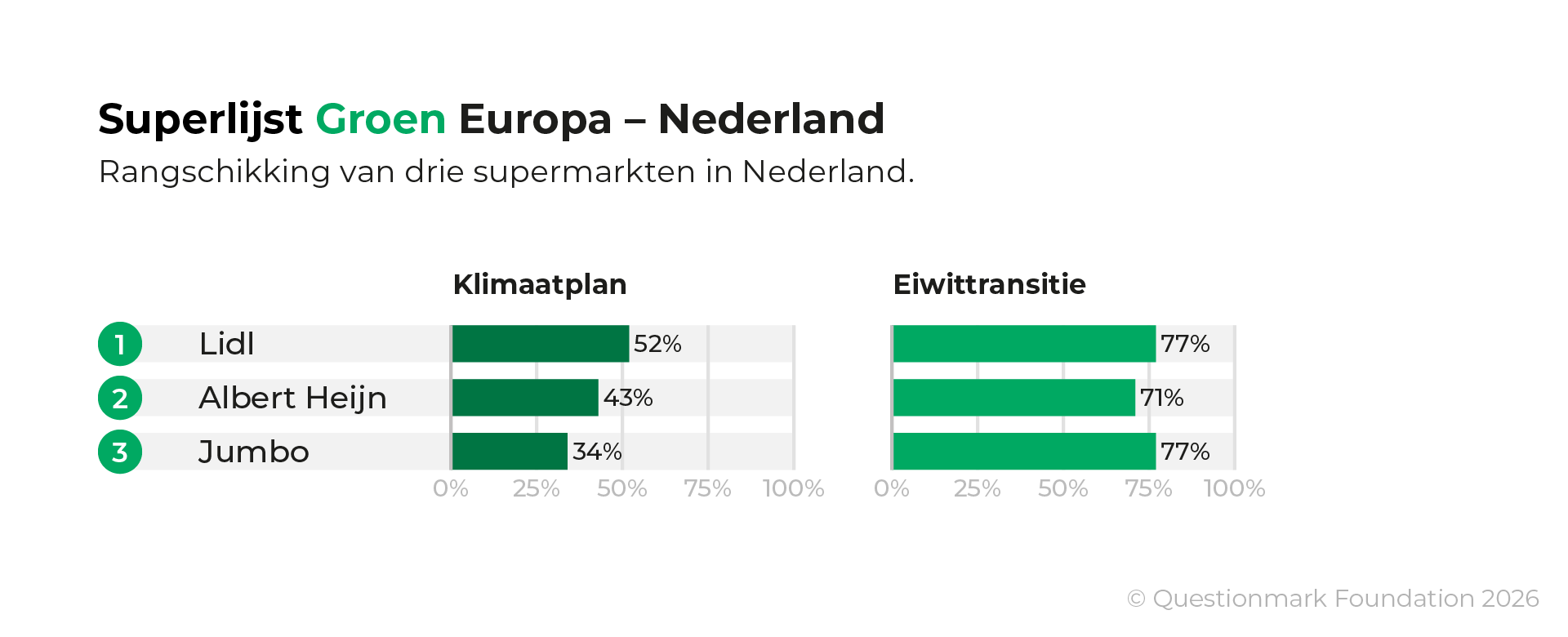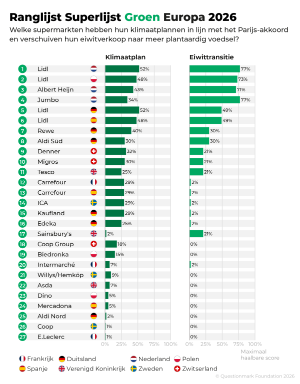 Superlijst Groen Europa 2026 vergeleek de duurzaamheidsdoelstellingen van 27 Europese supermarkten in acht landen. Lidl presteert in alle onderzochte landen beter dan de lokale concurrenten. Samen met Albert Heijn en Jumbo behoort het tot de best presterende supermarkten van deze Superlijst. In totaal hebben zeven supermarkten een gedetailleerde klimaatroutekaart gepubliceerd: Lidl (DE, NL, ES, PL), Albert Heijn en Carrefour (FR, ES). Ook geven zeven supermarkten – Albert Heijn, Jumbo, Lidl (DE, NL), Migros, Rewe en Tesco – financiële ondersteuning voor hun leveranciers om emissiereducties in de gehele keten te realiseren. Acht supermarkten hebben een plantaardig eiwitdoel gepubliceerd, waarvan vier doelen hebben in lijn met het Planetary Health Diet: Albert Heijn, Lidl (NL en PL) en Jumbo. Andere supermarkten nemen wat voorzichtigere stappen op dit thema. Negen supermarkten zetten nog geen stappen op de eiwittransitie.