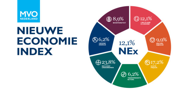 12,1% van de Nederlandse economie is duurzaam. Dit blijkt uit een grootschalig onderzoek in opdracht van MVO Nederland, de beweging van ondernemers in de nieuwe economie. De Nieuwe Economie Index (NEx), zoals dit cijfer wordt genoemd, geeft jaarlijks – en dit jaar voor het eerst – het percentage van de Nederlandse economie aan dat ‘nieuw’ is: circulair, klimaatneutraal en inclusief, ook in de keten. “Een NEx van 20% in 2025 is wat Nederland nodig heeft om een kantelpunt te bereiken – vanaf dat moment verduurzaamt de economie steeds sneller en is er geen weg meer terug naar de oude economie. Met een NEx van 12,1% in 2020 zien we dat het begin er zeker is. Maar er moet dus ook nog enorm veel gebeuren bij Nederlandse bedrijven”, zegt Maria van der Heijden, directeur-bestuurder van MVO Nederland.