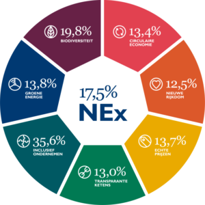 De NEx 2025 scoort als volgt op de zeven thema’s: nieuwe rijkdom (8,7%), echte prijzen (15,0%), transparante ketens (16,7%), inclusief ondernemen (39,5%), groene energie (13,7%), biodiversiteit (22,2%) en circulaire economie (14,0%). Het NEx-onderzoeksrapport is te vinden op de website van MVO Nederland . Lees hier ook het interview met zeven ondernemers uit het netwerk, luister de podcast met meer NEx-duiding door Ankie van Wersch en bekijk concrete tips en stappenplannen om als bedrijf aan de slag te gaan.