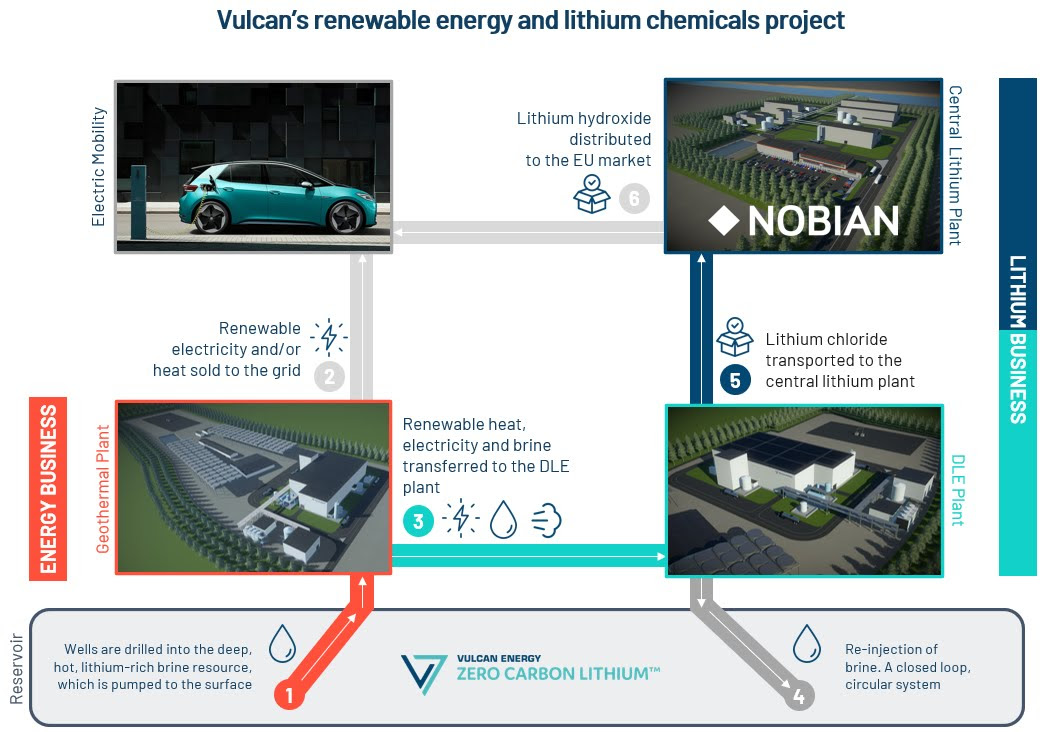Lithium transporteert de elektrische energie in een batterij en is een essentiële component in oplaadbare batterijen. Voor gebruik in batterijen voor elektrische voertuigen wordt lithiumchloride gewonnen uit de geothermische pekel van Vulcan met behulp van het Direct Lithium Extraction (DLE)-proces. Hierna wordt dit met elektrolyse en zonder gebruik van fossiele brandstoffen omgezet in lithiumhydroxide. Voor dit doel ontwikkelt Vulcan verschillende geothermie-installaties, aangrenzende DLE-installaties en een centrale lithiumhydroxidefabriek bij de geothermische lithiumreservoirs in het Boven-Rijndal gebied in Duitsland.