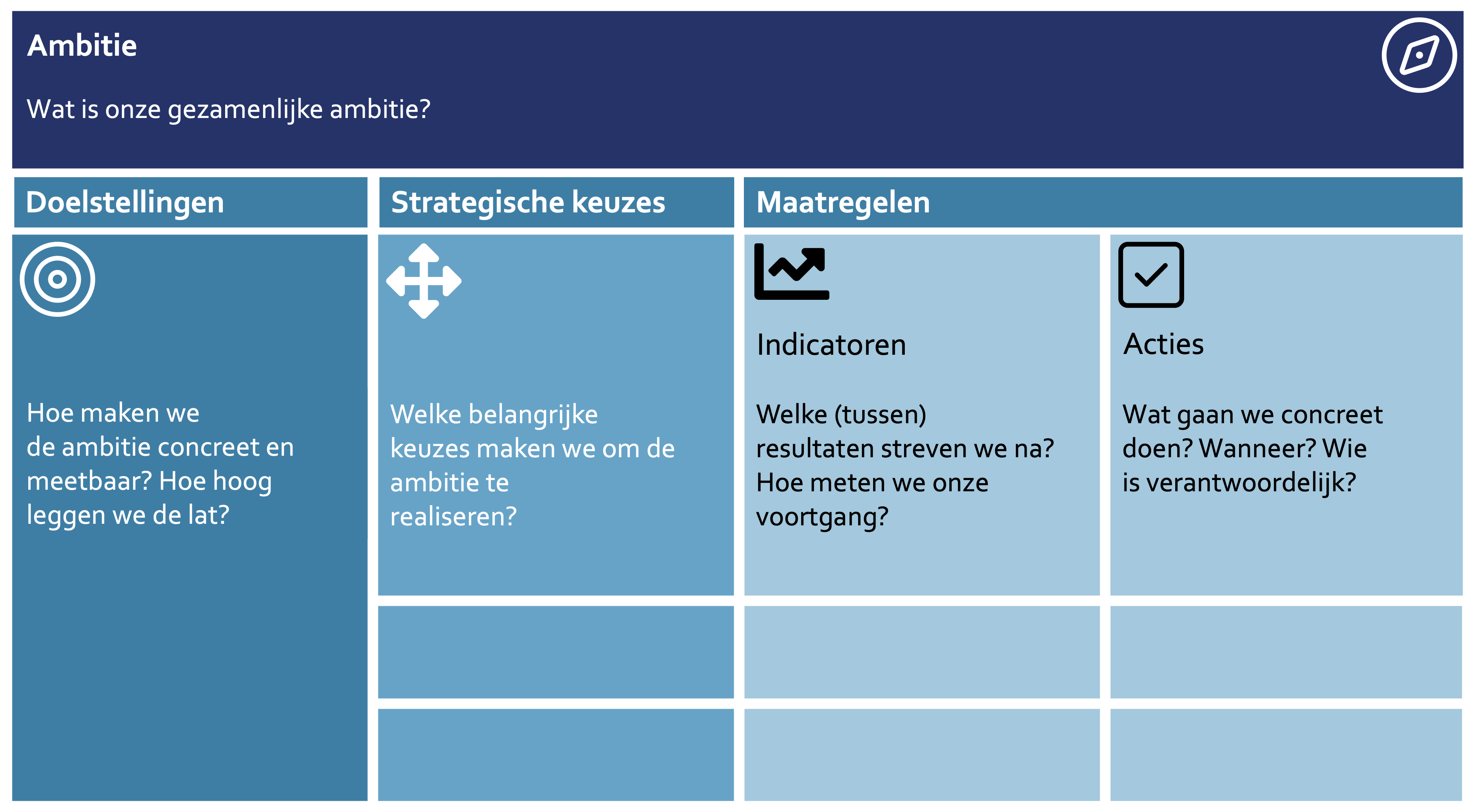 Neem als voorbeeld een organisatie die binnen drie jaar koploper wil zijn in haar industrie op het gebied van duurzaam en sociaal ondernemen door een circulaire en inclusieve bedrijfsvoering met een focus op technologische innovatie. De doelstellingen bepalen hoe hoog de lat van deze ambitie ligt. Denk hierbij aan het percentage reductie van scope 1- en 2-emissies, het aandeel hergebruikte materialen in producten, de mate van inclusiviteit binnen de bedrijfsvoering, het stimuleren van persoonlijke ontwikkeling van medewerkers, het aantal technologische innovaties dat bijdraagt aan het verkleinen van de ecologische voetafdruk en het rendement op ESG-investeringen. Welke specifieke doelstellingen de organisatie kiest, hangt af van de kernaspecten van haar ambitie, de gebieden waarop zij wil sturen en de criteria waaraan haar succes wordt afgemeten.