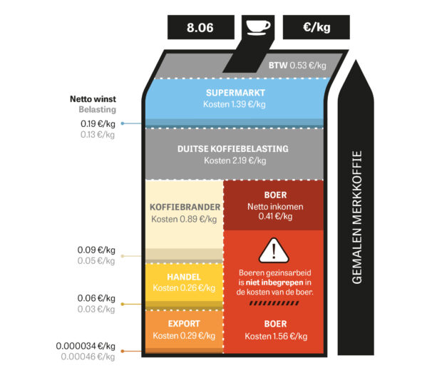 Uit het onderzoek ‘The grounds for sharing; a study of value distribution in the coffee industry’ blijkt dat de waarde vooral ophoopt ver weg van boeren in de waardeketen – van importeur tot supermarkt.