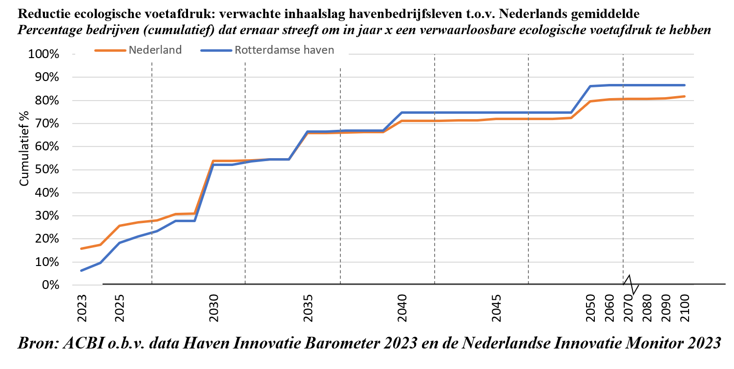 52% van de ondervraagde bedrijven geeft aan dat ze trachten om nagenoeg klimaatneutraal te zullen zijn in 2030. Dit ligt twee procentpunten onder het Nederlands gemiddelde. Het gros van de bedrijven die ernaar streven in 2030 klimaatneutraal te zijn heeft in de afgelopen vijf jaar aanzienlijk geïnvesteerd in verduurzaming. Ruim een vijfde van de bedrijven in de haven streeft ernaar om tussen 2031 en 2040 de ecologische voetafdruk te hebben gereduceerd tot een verwaarloosbare hoeveelheid, en voor 11% geldt het streven om dit tussen 2041 en 2050 te hebben gerealiseerd. Tegen die tijd wil bijna drie op de vier bedrijven in de sector chemie, raffinage en utilities op dit punt zijn beland, en zelfs 86% van alle ondervraagde bedrijven. Henk Volberda: ‘Deze percentages zeggen iets over het ambitieniveau van het havenbedrijfsleven als geheel, met een relatief groot aandeel energie-intensieve en relatief vervuilende bedrijven ten opzichte van de rest van Nederland.’ Slechts 13% van de bedrijven in de Rotterdamse haven stelt in het geheel niet te streven naar het reduceren van hun ecologische voetafdruk naar een verwaarloosbare hoeveelheid; landelijk ligt dit percentage hoger (18%).