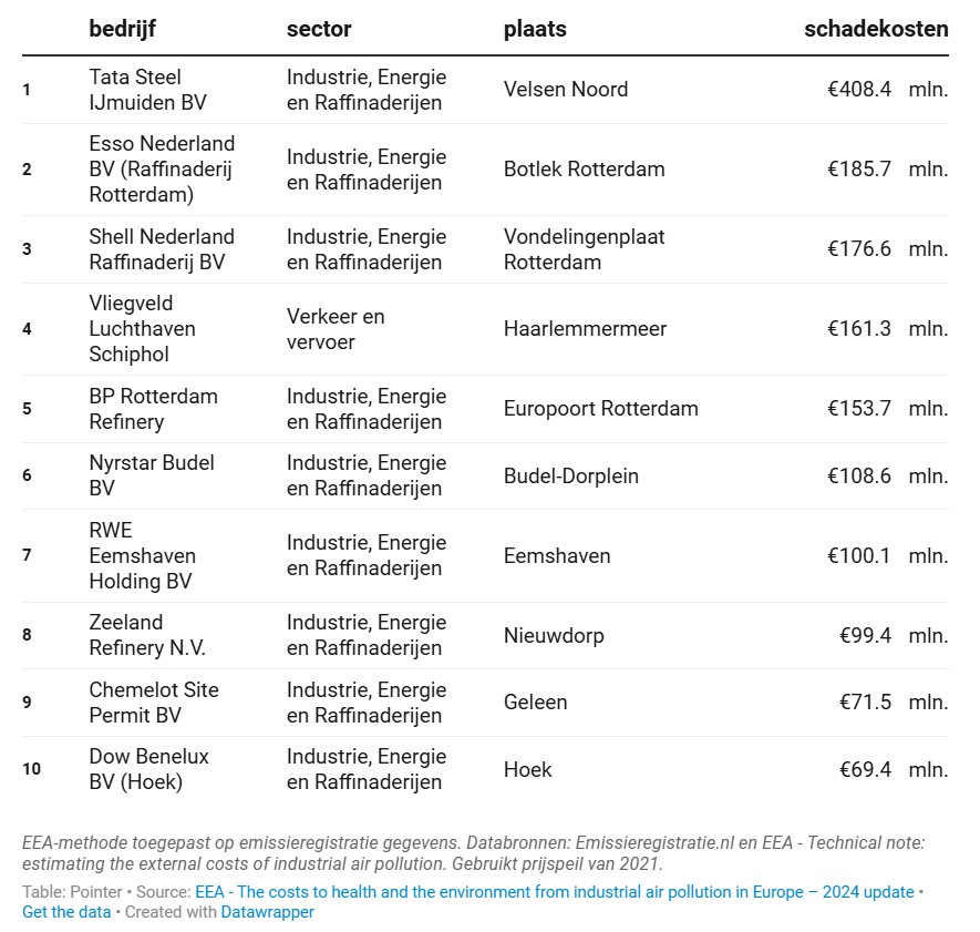 De industrie, energie en raffinaderijen schrijven bij elkaar 3,1 miljard euro aan schade. De uitstoot van industriële vervuiling is duidelijk aanwijsbaar bij specifieke bedrijven. De top drie van 2022 bestaat uit Tata Steel (408 miljoen euro schade) en de Rotterdamse raffinaderijen van Esso (€185 miljoen euro) en Shell (176 miljoen euro).