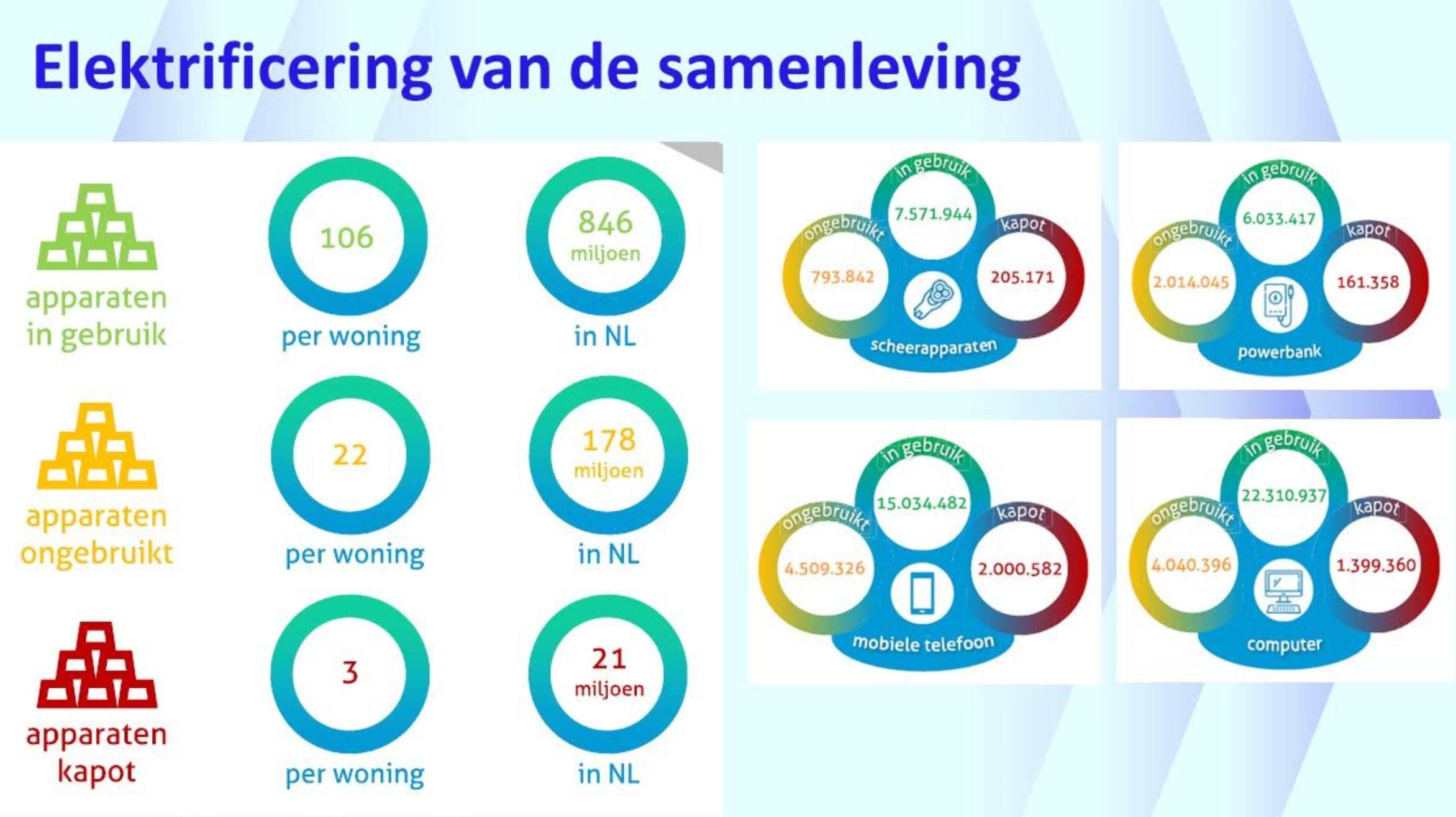 Volgens de Verenigde Naties wordt er in 2023 wereldwijd 8 kilo elektrisch afval per persoon geproduceerd. Dit betekent elk jaar 61,3 miljoen ton elektrisch afval, meer dan het gewicht van de Chinese Muur. Slechts 17,4% van dit afval, dat behalve schadelijke stoffen ook kostbare materialen bevat, wordt wereldwijd op de juiste manier ingezameld, behandeld en gerecycled. De resterende 50,6 miljoen ton wordt op vuilnisplaatsen gestort, verbrand of verhandeld of opgeslagen bij huishoudens. Zelfs in Europa, dat toonaangevend is in de wereld op het gebied van de recycling van elektronisch afval, wordt 54% van het elektronisch afval officieel gerapporteerd als ingezameld en gerecycled.