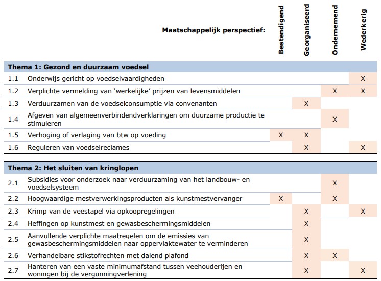 De 27 mogelijke beleidsmaatregelen zijn beoordeeld op effectiviteit, uitvoerbaarheid en legitimiteit om doelen te bereiken op vier actuele thema’s: gezond en duurzaam voedsel; het sluiten van kringlopen; landbouw en natuur in balans; en het duurzaam verdienvermogen in de landbouw. Het gaat om een kwalitatieve analyse. Duidelijk is dat geen van de uitgewerkte maatregelen makkelijk te nemen is of op alle doelstellingen positief uitwerkt. De concrete invulling van maatregelen is uiteindelijk bepalend voor de precieze uitwerking ervan op de beschouwde thema’s.