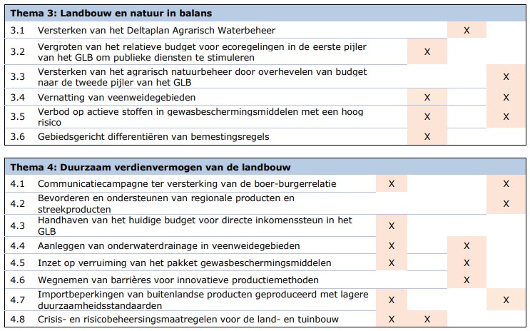 Het PBL heeft in het rapport Kansrijk landbouw- en voedselbeleid op basis van het politieke en maatschappelijke debat een breed spectrum aan mogelijke beleidsmaatregelen geïnventariseerd en geanalyseerd op effectiviteit, uitvoerbaarheid en juridische legitimiteit. Uiteindelijk zijn 27 beleidsmaatregelen gericht op de kernthema’s gezond en duurzaam voedsel, het sluiten van kringlopen, de balans tussen landbouw en natuur en het duurzaam verdienvermogen in de landbouw beschouwd. Uit het rapport blijkt dat er geen ‘laaghangend fruit’ is, dat wil zeggen dat geen van de maatregelen positief werkt voor alle beschouwde opgaven op het gebied van de leefomgeving, de economie en sociale aspecten, en tegelijkertijd gemakkelijk te nemen is. Welke maatregelen met welke effecten het meest relevant zijn om problemen binnen de landbouw- en voedselsysteem op te lossen is een politieke keuze.