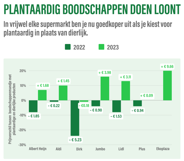 Questionmark vergeleek de prijzen van boodschappenmandjes gevuld met de twaalf meest voorkomende productsoorten, waaronder vegetarische balletjes, plantaardige kaas en plantaardige yoghurt. Steeds werd de goedkoopste plantaardige versie vergeleken met de goedkoopste dierlijke tegenhangers van diezelfde producten in de supermarkten Albert Heijn, Aldi, Dirk, Jumbo, Lidl, Plus en Ekoplaza. Bij vrijwel alle supermarkten is de consument die plantaardig kiest het goedkoopst uit. Het prijsvoordeel kan oplopen tot wel €9,66 bij Ekoplaza, een besparing van maar liefst 20%. Ook bij Jumbo en Lidl is de prijsbewuste consument een stuk voordeliger uit met het plantaardige mandje (resp. €3,89 en €3,11). Alleen bij Dirk betaalt de consument nog €0,18 meer voor een mandje gevuld met plantaardige producten.
