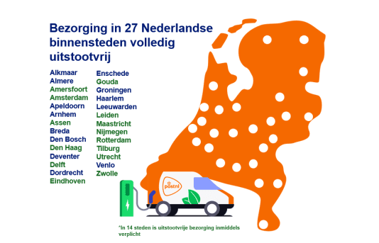 PostNL bezorgt in steeds meer Nederlandse binnensteden met elektrische vervoermiddelen. Sinds begin dit jaar bezorgt PostNL in 27 Nederlandse binnensteden volledig uitstootvrij. Dat is meer dan de 14 binnensteden waar dit sinds dit jaar bij wet verplicht is. Zo bezorgt PostNL vanaf nu in het volledige gebied binnen de ring A10 van Amsterdam emissievrij. Dat gebied is 3,5 keer groter dan het officiële zero-emissiegebied van de gemeente.