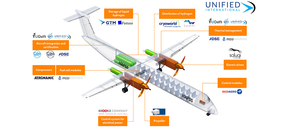 Het wereldwijd allereerste grotere passagiersvliegtuig (40-80 zitplaatsen) op vloeibare groene waterstof moet in 2028 tussen Nederland en Londen gaan vliegen. Een uniek huzarenstukje: een grote Nederlandse samenwerking bouwt een waterstofsysteem voor vliegtuigen, helemaal groen, van brandstof tot aandrijving. Het systeem is opschaalbaar naar grotere vliegtuigen. En is vollédig van Nederlandse bodem. Daarmee wordt Nederland wereldwijd de belangrijkste leverancier voor vliegen op waterstof. Geen CO2 of stikstof meer uit de uitlaat, dus zero CO2-emission air travel. En die eerste vlucht is geen eendagsvlieg: de bedoeling is dat er vanaf 2028 al meerdere commerciële vluchten wereldwijd gaan vliegen. Hydrogen Aircraft Powertrain and Storage System (HAPSS) is een volledig Nederlandse publiek-private samenwerking, opgezet door Unified International en InnovationQuarter met 17 bedrijven, waaronder Fokker, TU Delft, Rijksoverheid en het Koninklijk Nederlands Lucht- en Ruimtevaartcentrum. Vanuit het Nationaal Groeifonds werd € 383 mln. toegekend aan het programma Luchtvaart in Transitie, waarvan het HAPSS-project het grootste onderdeel is. Het systeem is in 2025 al op labschaal gereed.