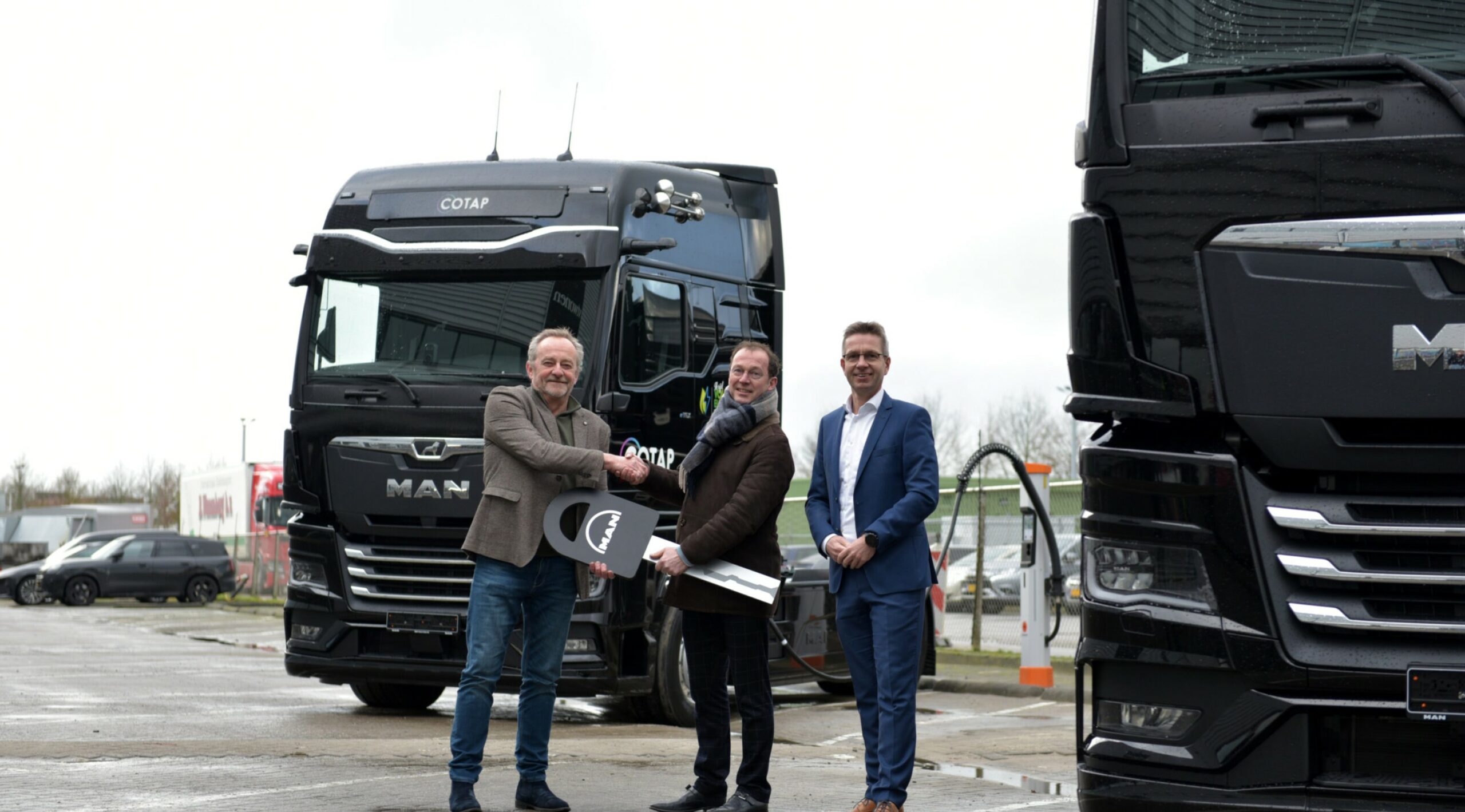 Gepubliceerd 3 februari 2025 op 2560 × 1419 in Primeur voor Cotap met twee MAN eTGX trekkers