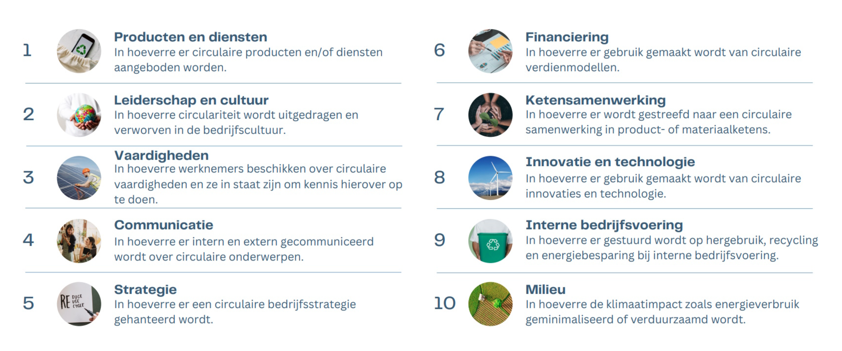 Niet alleen het aanbieden of produceren van circulaire producten wordt gemeten. Een vraag is ook of er circulaire verdienmodellen worden toegepast, of het bedrijf over circulaire ontwikkelingen communiceert en of het bedrijf bezig is met hergebruik, recycling en energiebesparing bij de bedrijfsvoering.