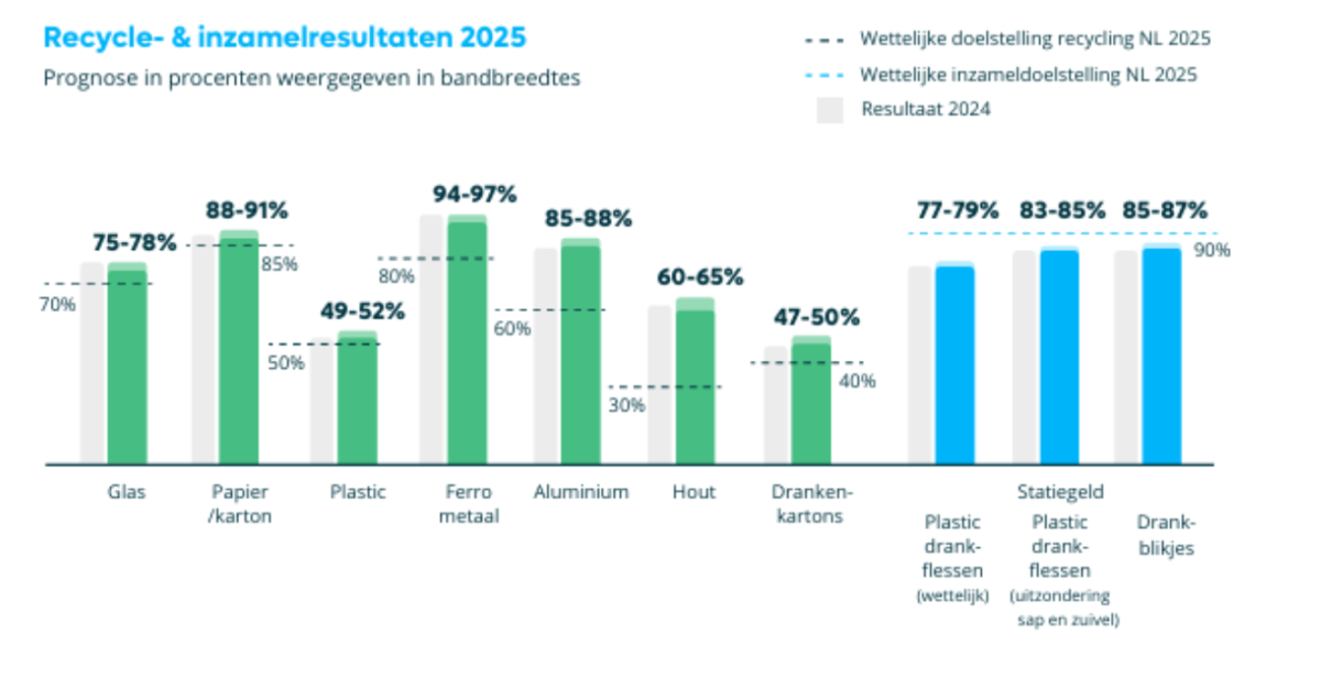 Nog niet alle recycling- en inzamelgegevens zijn binnen, de prognose wordt daarom in bandbreedtes weergegeven. De officiële resultaten inclusief de resultaten met hergebruik van verpakkingen volgen in augustus.