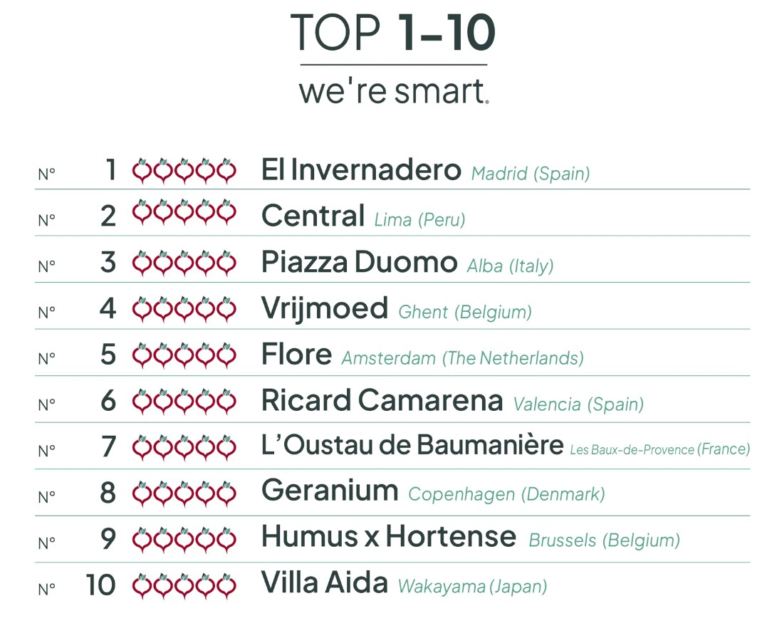 Het restaurant El Invernadero (Madrid, Spanje) van chef Rodrigo de la Calle is door We’re Smart uitgeroepen tot het beste plantaardige restaurant ter wereld. Frank Fol, oprichter We’re Smart: “Rodrigo de la Calle is een van de meest invloedrijke chefs in de plantaardige gastronomie. Hij transformeert alledaagse groenten in verfijnde gerechten met complexe smaken en texturen. Zijn keuken legt een sterke nadruk op duurzaamheid: hij werkt met seizoensgebonden producten en lokale leveranciers, en strijdt tegen voedselverspilling. Smaak en genot staan centraal in zijn gerechten. Hij weet de natuurlijke zoetheid en andere smaken van groenten naar voren te brengen, en beheerst een breed scala aan kooktechnieken.”