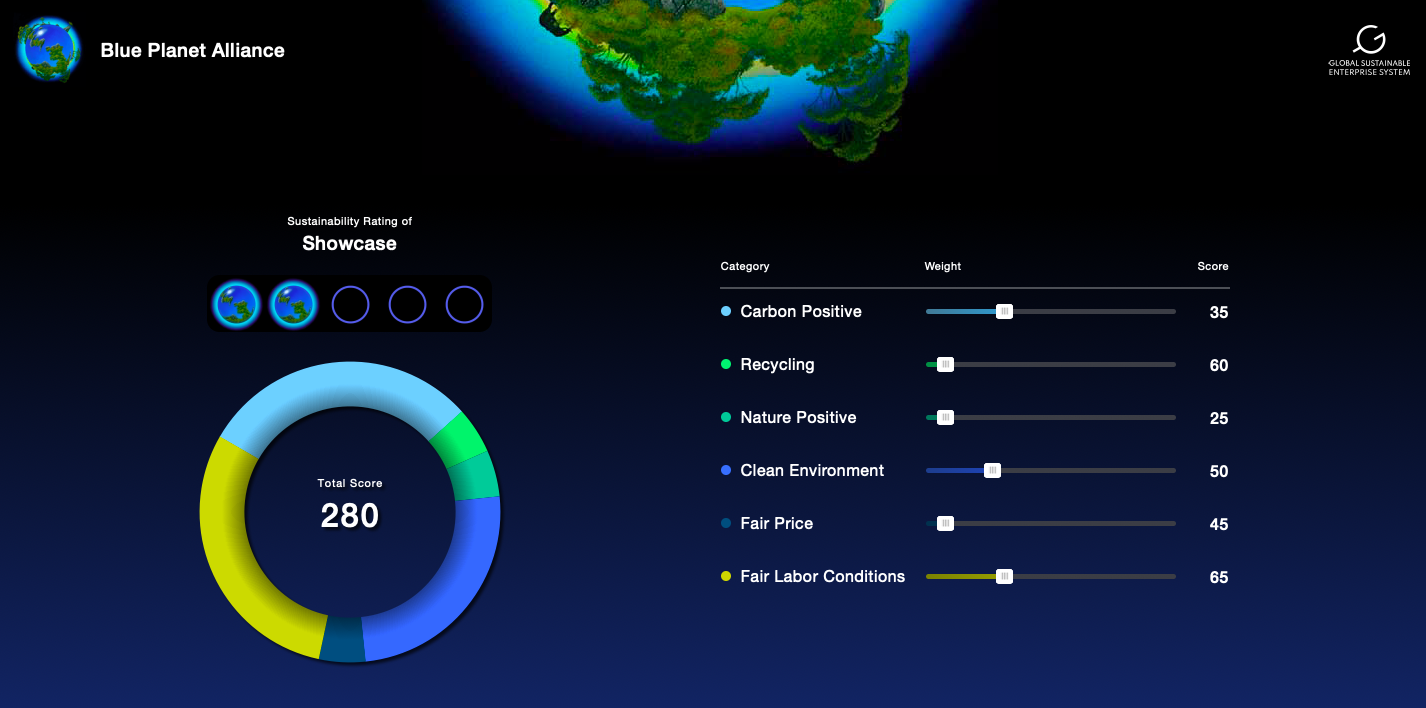 Het Global Sustainable Enterprise System is een erkend rating platform (GSES System) dat helpt bij het beoordelen, verifiëren en certificeren van duurzaamheidsprestaties op proces-, supply chain- en productniveau. GSES System lijnt gemakkelijk en kosteneffectief meer dan 550 ecolabels, frameworks en certificaten uit, en gebruikt wereldwijd geaccepteerde normen om duurzaamheidsprestaties holistisch te meten. Zo kan alles worden geïntegreerd in duurzame inkoop- of investeringsprocessen. Het GSES System heeft de nieuwe Blue Planets module ontworpen om e-commerce platforms en fysieke winkels te bedienen met een geverifieerde duurzaamheidsrating voor producten, diensten en services. Deze ratings kunnen door consumenten worden gebruikt om bewust en kwantitatief duurzaam in te kopen online en in fysieke winkels. Dit is wereldwijd de enige schaalbare, onafhankelijk geverifieerde en snelle oplossing voor het meten van hele assortimenten, supply chains en service providers.