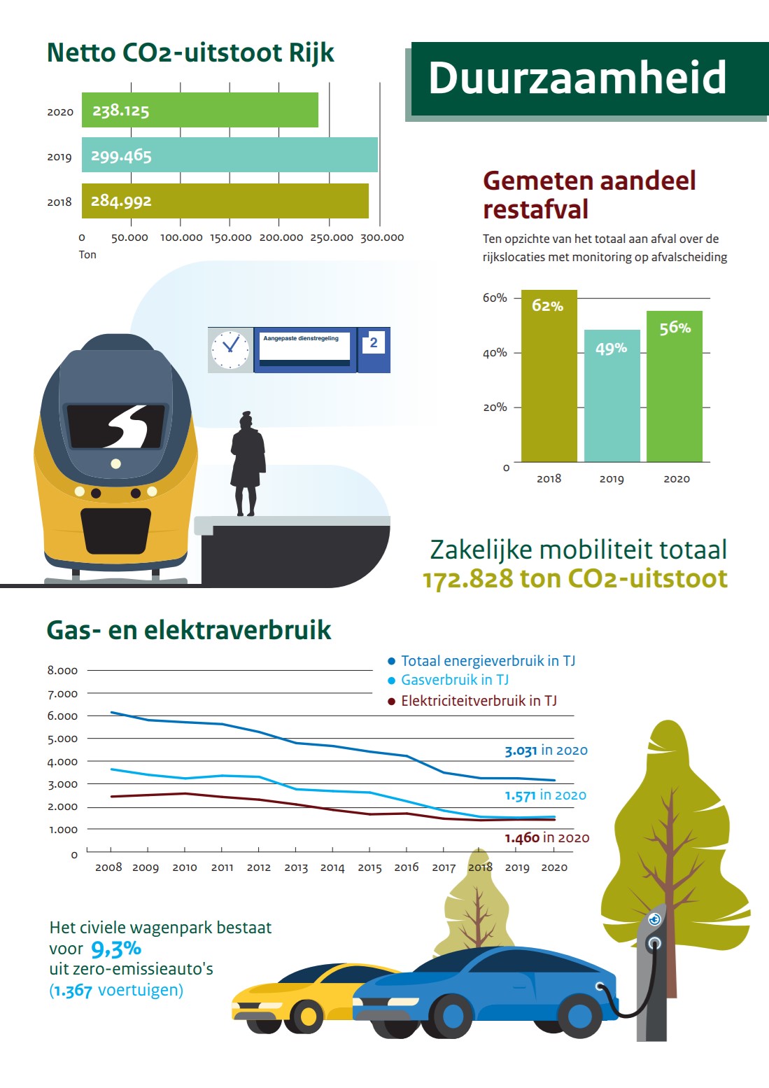 Het Rijk werkt aan een duurzaam herstel uit de coronacrisis. De inhaalslag voor de verduurzaming van de rijksbedrijfsvoering wordt daarom met een nieuw rijksbreed programma versterkt. Er liggen veel kansen, bijvoorbeeld op het vlak van huisvesting in combinatie met het verminderen van woon-werkverkeer door hybride werken. Ook de rijksbrede inkoopstrategie “Inkopen met Impact” biedt mogelijkheden voor duurzaamheid.