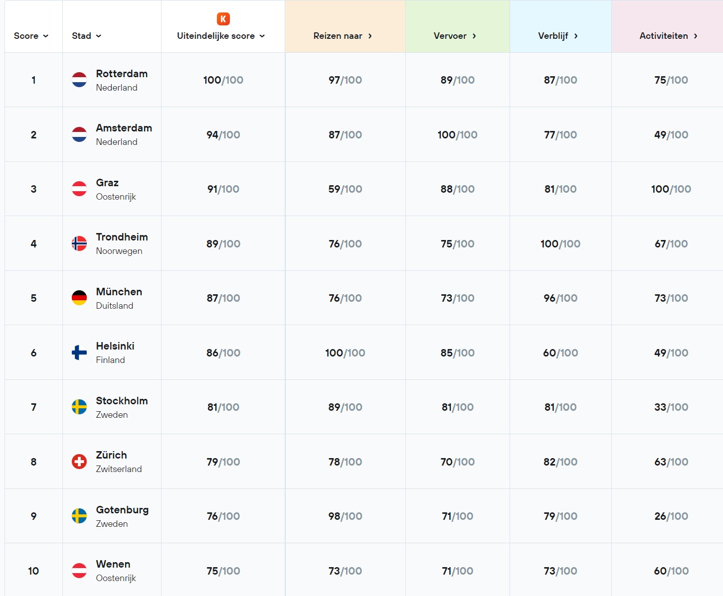 Rotterdam, Amsterdam en Graz vormen de top 3 van KAYAK;s stedenindex. De volledige top 10 bestaat zelfs uit Europese steden. Rotterdam heeft de perfecte en hoogste score behaald 100. Dit komt onder andere door het geavanceerde CO2-managementsysteem van de luchthaven, gecertificeerd door de Airport Carbon Accreditation, het grote aantal voordelig geprijsde accommodaties, allemaal gekwalificeerd door het Duurzaam Reizen-programma van Booking.com***, het goede openbaar vervoer in de stad en de fantastische lengte aan fietspaden. Amsterdam heeft de tweede plaats weten te bemachtigen met een score van 94. De stad is wereldberoemd om haar fietsvriendelijkheid en de autovrije straten, met goede opties voor milieuvriendelijke huurauto’s en voldoende EV-laadplekken. Graz in Oostenrijk, staat op de derde plaats en heeft de hoge score van 91 te danken aan het goede treinsysteem, voldoende EV-laadplekken en een autovrij UNESCO Werelderfgoed-stadscentrum.