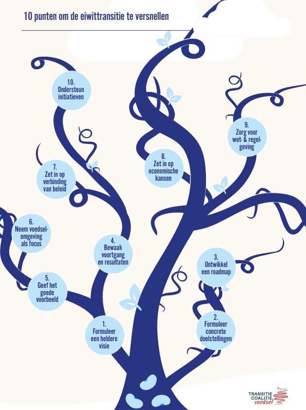 Het plan bevat onder andere adviezen over het formuleren van een heldere visie en concrete doelstellingen; het geven van het goede voorbeeld; het bewaken van de voortgang; het bevorderen van wet- en regelgeving en het ondersteunen van initiatieven die bijdragen aan de eiwittransitie. Het tienpuntenplan wordt ondersteund door de Nationale Week Zonder Vlees en Zuivel en is tot stand gekomen met input van o.a. WNF NL, Voeding Leeft, ProVeg, Natuur & Milieu, IUCN Nl, Instituut voor Milieuvraagstukken – Vrije Universiteit, Feedback EU en de Dierencoalitie.