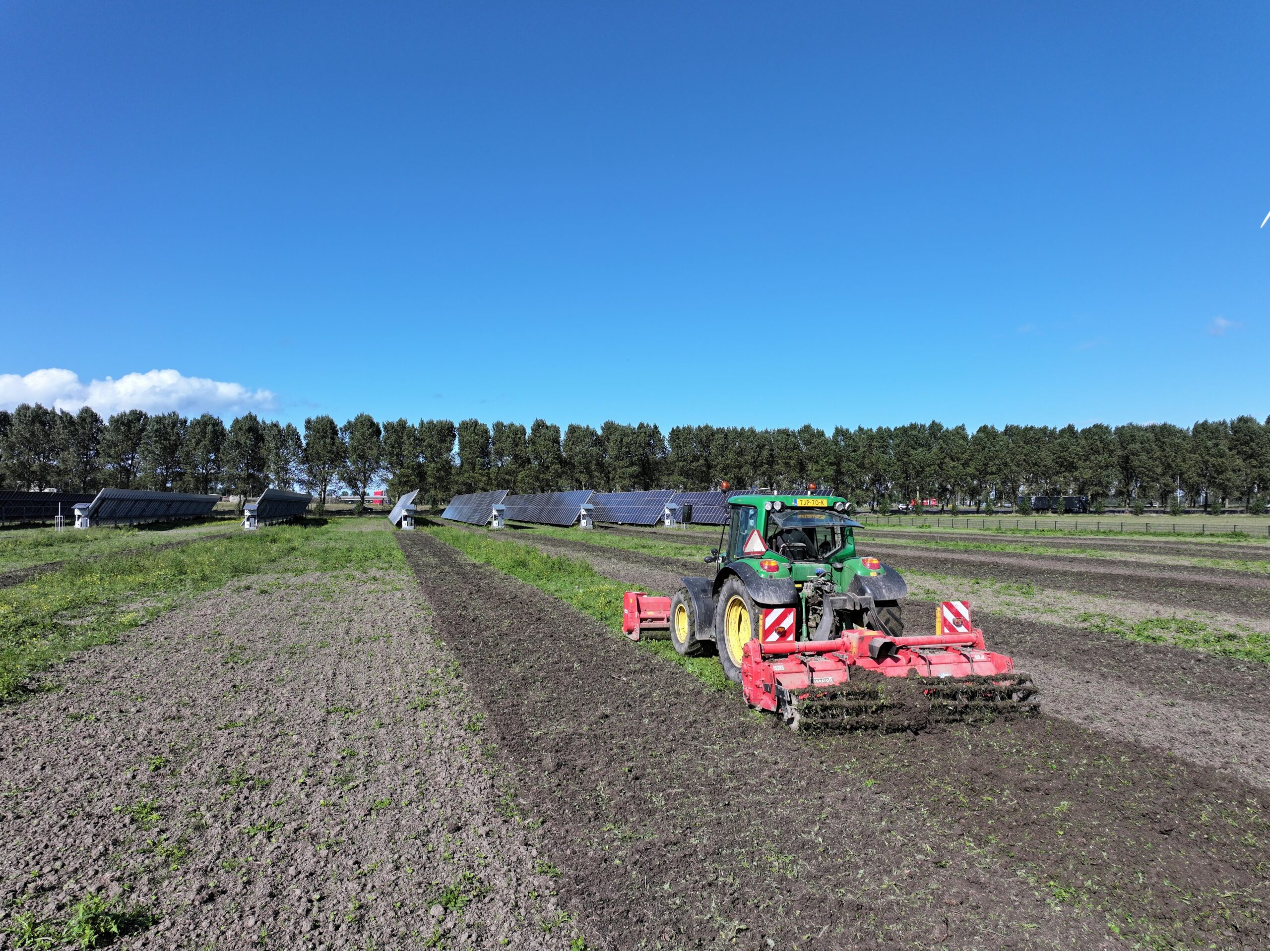 Het doel van het project is een extra plus voor de agrariër. Dit willen we bereiken door te onderzoeken hoe we zo goed mogelijk samen kunnen werken en de impact op de gewasgroei kunnen minimaliseren en idealiter zelfs kunnen verbeteren. De rijen met zonnepanelen staan 9 en 15 meter uit elkaar om de invloed van schaduw te bepalen. Het zonnepark heeft een vermogen van 0,7MWp.