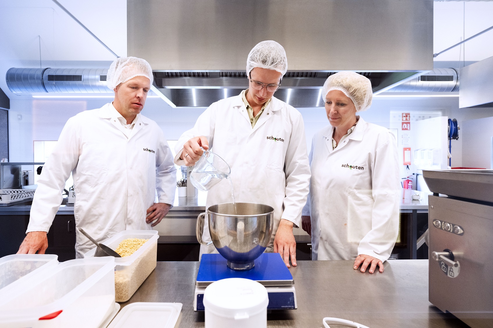 Marketing Manager Mark van Noorloos (links) met collega’s in de R&D keuken van Schouten