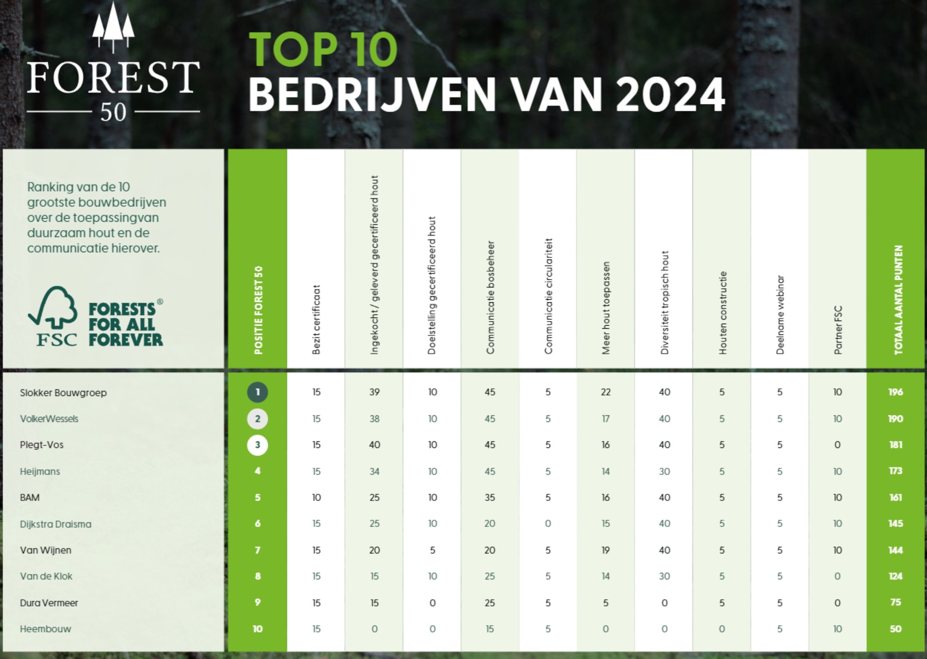Dankzij de Forest50 kunnen opdrachtgevers kiezen voor die bouwbedrijven die aantoonbaar goed presteren met betrekking tot inkoop en toepassing van duurzaam hout. De ranking geeft een impuls aan meer transparantie over het gebruik van hout uit verantwoord beheerde bossen. Al jaren staan namen als Heijmans, VolkerWessels, Slokker Bouwgroep en BAM bovenaan in de ranglijsten. En hoewel deze bedrijven nog steeds erg hoog scoren, brachten de strengere criteria van dit jaar, brachten een nieuwe naam mee. Plegt-Vos was afgelopen jaar al de snelste stijger en belandde nu in de top 3.
