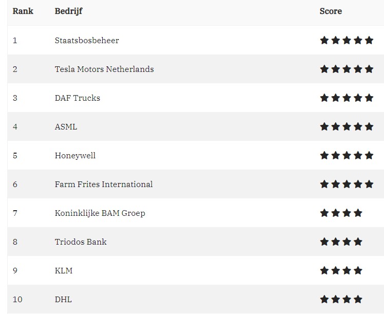 Zie de volledige top 25 ranking voor duurzaamheid hier.